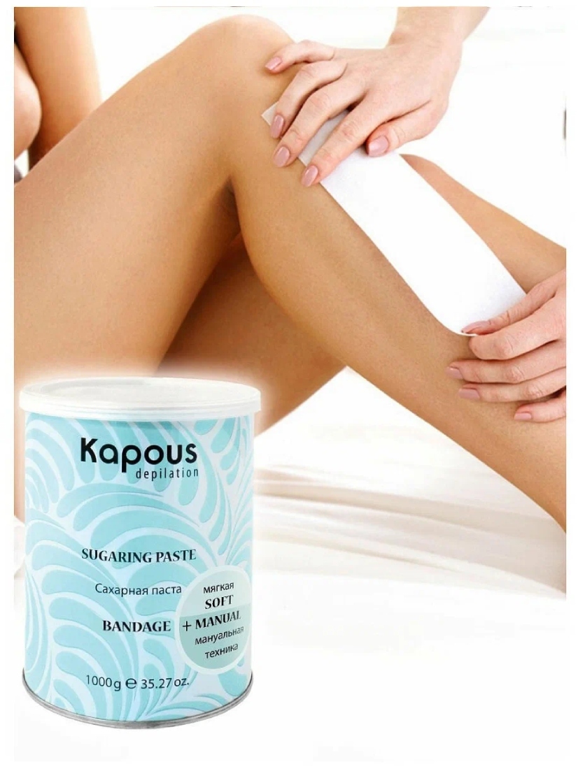 В процедуре используется чуть теплая паста, поэтому риск ожога отсутствует. Удаляет волоски полностью, не ломая их у основания и не повреждая кожу. Имеет скрабирующий эффект на коже, за счет чего кожа становится еще более гладкой. Сахарная паста имеет жидкую консистенцию и предназначена для проведения процедуры депиляции бандажной техникой на больших участках тела (руки, ноги, спина). Бандажную сахарную пасту можно смешивать с пастой средней плотности при работе мануальной и шпательной техникой. Подогретая в баночном воскоплаве Kapous depilation бандажная сахарная паста наносится при помощи шпателя тонким слоем против роста волос и удаляется полосками для депиляции по росту волос. Натуральный состав сахарной пасты исключает аллергические реакции, подходит для чувствительной кожи.