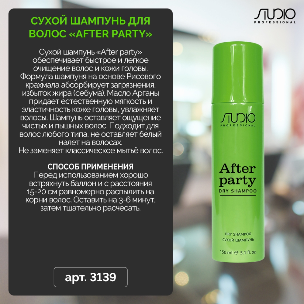 Сухой шампунь «Afrter party» обеспечивает быстрое и легкое очищение волос и кожи головы без использования воды и рекомендуется для применения на всех типах волос.Оригинальная формула шампуня на основе экстракта Бамбука-защита волос от обезвоживания, Рисовой муки-абсорбирующие свойства, эфирных масел-антисептический и успокаивающий эффект, позволяет очищать волосы, придавая им опрятный вид. Шампунь поглощает излишки себума, регулируя работу сальных желез, позволяет реже мыть волосы. Через несколько минут после нанесения волосы становятся объемными и легкими.