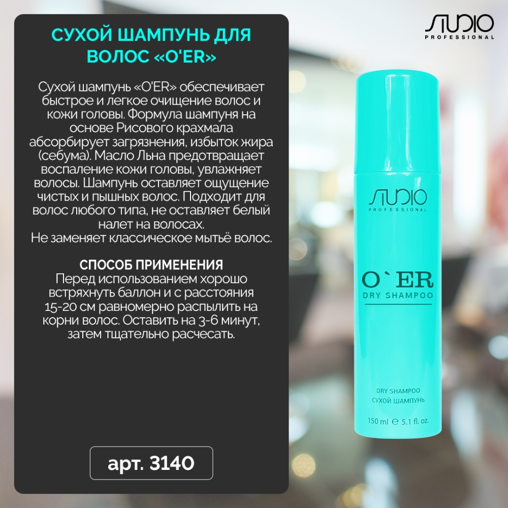 Сухой шампунь «O'ER» обеспечивает быстрое и легкое очищение волос и кожи головы без использования воды и рекомендуется для применения на всех типах волос.Оригинальная формула шампуня на основе экстракта Бамбука-защита волос от обезвоживания, Рисовой муки-абсорбирующие свойства, эфирных масел-антисептический и успокаивающий эффект, позволяет очищать волосы, придавая им опрятный вид. Шампунь поглощает излишки себума, регулируя работу сальных желез, позволяет реже мыть волосы. Через несколько минут после нанесения волосы становятся объемными и легкими.