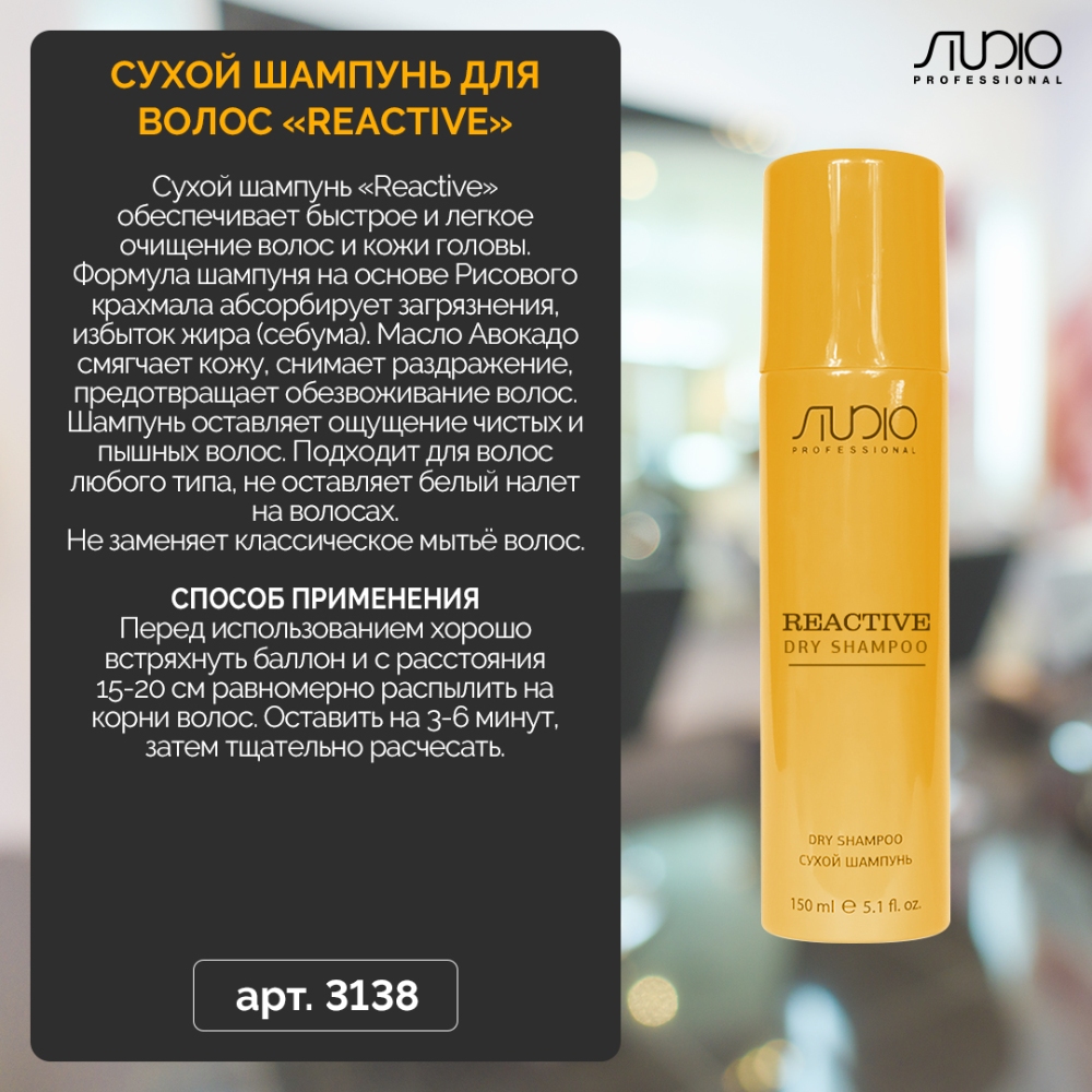 Сухой шампунь «Reactive» обеспечивает быстрое и легкое очищение волос и кожи головы без использования воды и рекомендуется для применения на всех типах волос.Оригинальная формула шампуня на основе экстракта Бамбука-защита волос от обезвоживания, Рисовой муки-абсорбирующие свойства, эфирных масел-антисептический и успокаивающий эффект, позволяет очищать волосы, придавая им опрятный вид. Шампунь поглощает излишки себума, регулируя работу сальных желез, позволяет реже мыть волосы. Через несколько минут после нанесения волосы становятся объемными и легкими.
