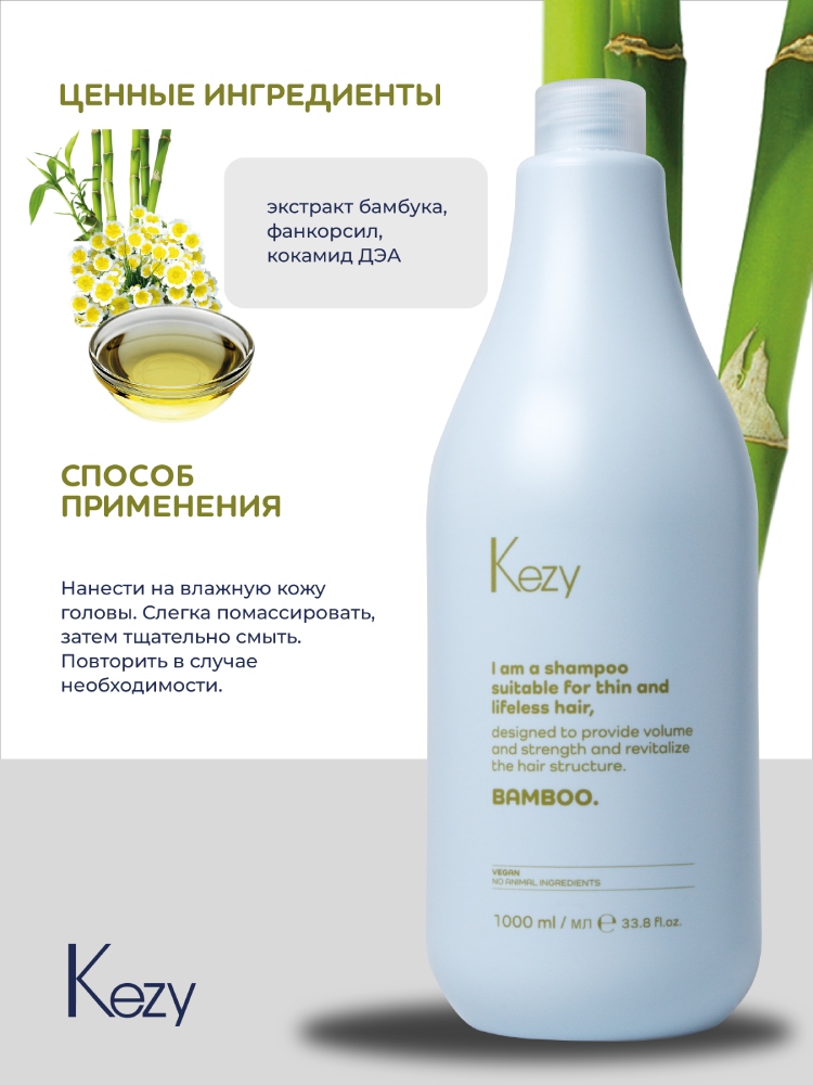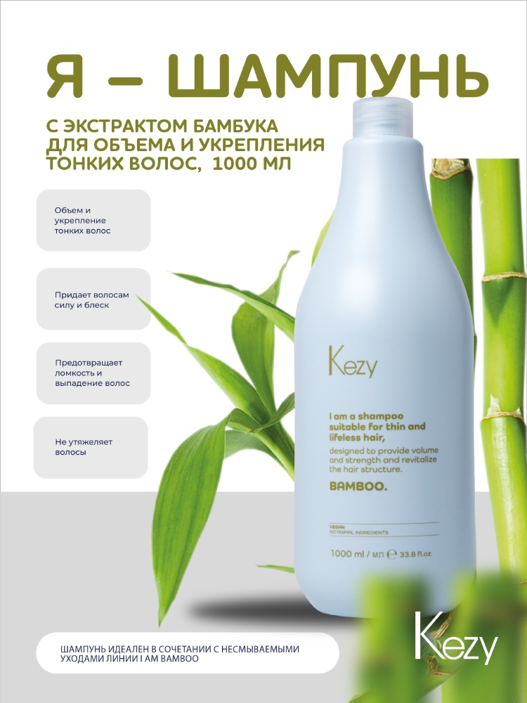 Kezy I am BAMBOO Шампунь с экстрактом бамбука для объема и укрепления тонких волос, 1000 мл.