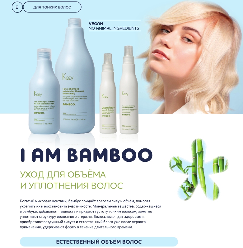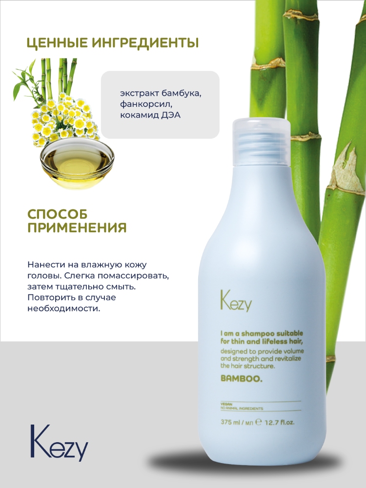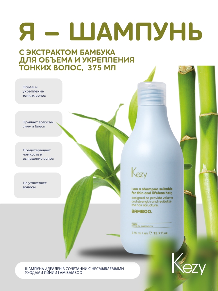 Kezy I am BAMBOO Шампунь с экстрактом бамбука для объема и укрепления тонких волос, 375 мл.