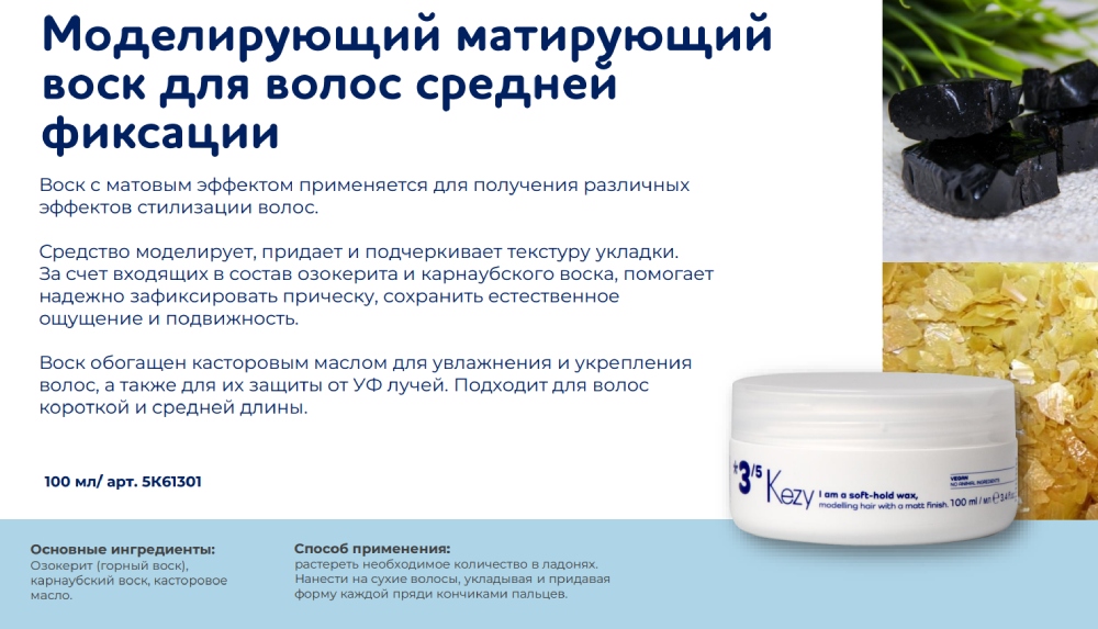 Воск с матовым эффектом применяется для получения различных эффектов стилизации волос. Средство моделирует, придает и подчеркивает текстуру укладки. За счет входящих в состав озокерита и карнаубского воска, помогает надежно зафиксировать прическу, сохранить естественное ощущение и подвижность. Воск обогащен касторовым маслом для увлажнения и укрепления волос, а также для их защиты от УФ лучей. Подходит для волос короткой и средней длины.