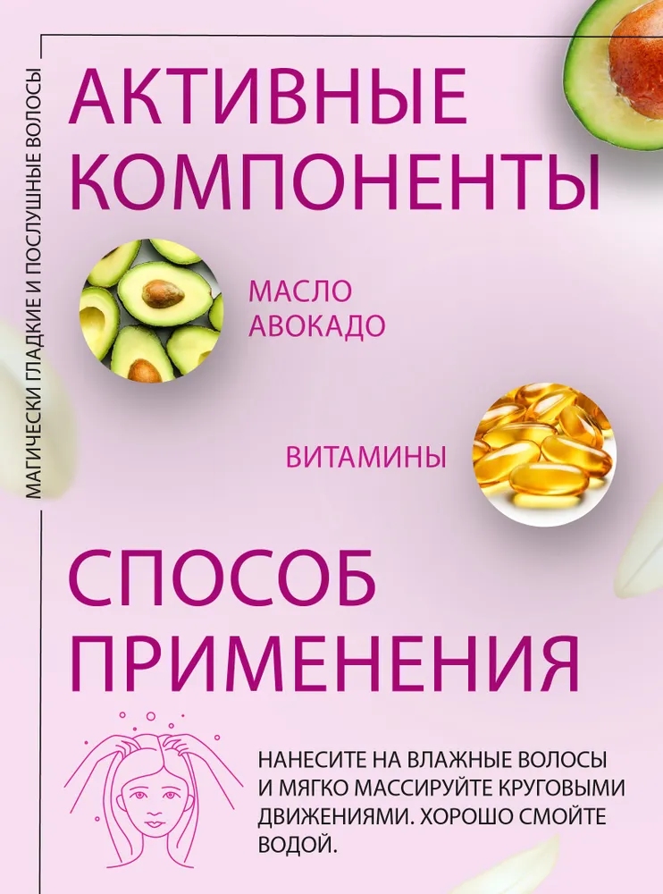 Дисциплинирует и увлажняет вьющиеся и непослушные волосы благодаря Гуаровой камеди в составе, которая обладает антистатическими и разглаживающими свойствами, делает волосы мягкими и защищает их от влажности. Способ применения: нанесите на влажные волосы и мягко массируйте круговыми движениями. Хорошо смойте. Повторите при необходимости.