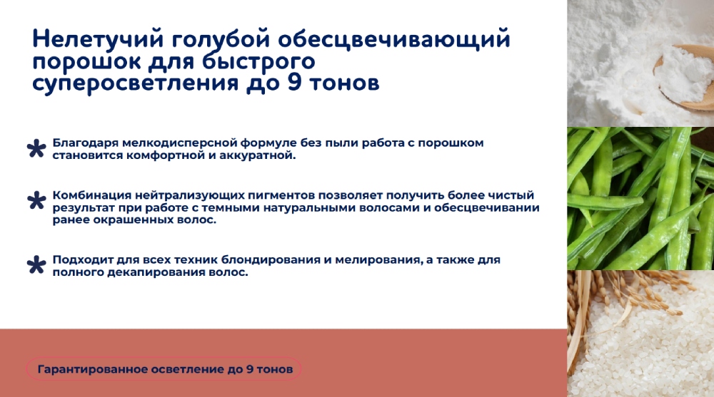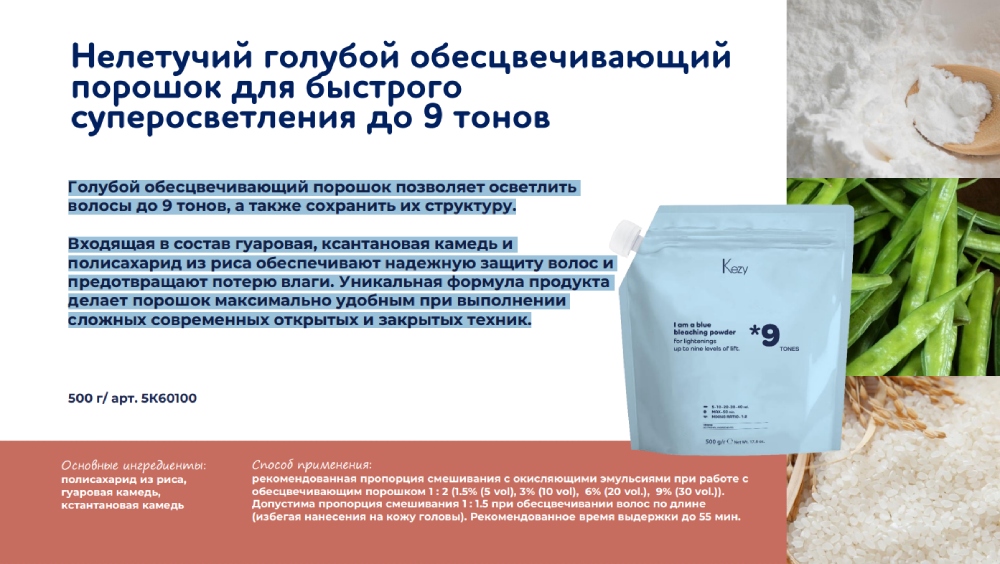 Голубой обесцвечивающий порошок позволяет осветлить волосы до 9 тонов, а также сохранить их структуру. Входящая в состав гуаровая, ксантановая камедь и полисахарид из риса обеспечивают надежную защиту волос и предотвращают потерю влаги. Уникальная формула продукта делает порошок максимально удобным при выполнении сложных современных открытых и закрытых техник.