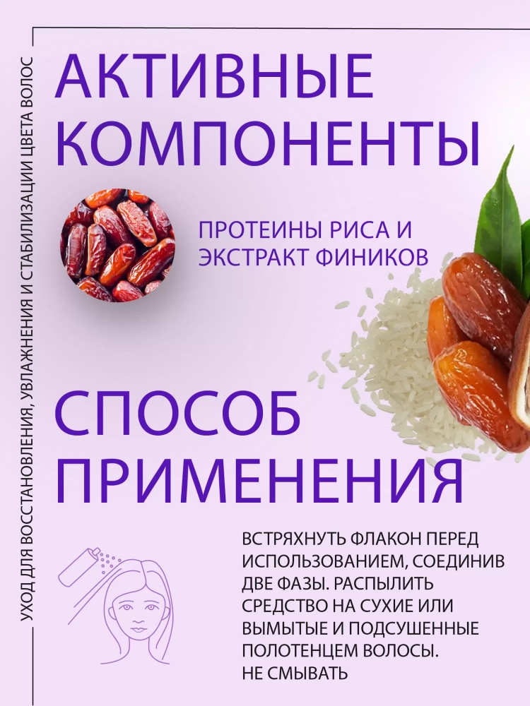 Двухфазный кондиционер мгновенного действия, не требующий смывания. Улучшает расчесывание и помогает устранить спутанность волос. Придаёт волосам блеск и объём. Устраняет электростатический эффект. Идеальное средство для ухода за волосами после химической завивки и окрашивания волос. Активные компоненты: Биотин - оптимизирует клеточный обмен, борется со старением. Протеины риса – увлажняют и восстанавливают структуру волоса. Витамин Е - защищает от УФ излучения и подчеркивает блеск окрашенных волос. Кукурузное масло – питает и увлажняет волосы. Придает волосам блеск, эластичность и силу. Экстракт японского васаби – укрепляет, увлажняет и восстанавливает волосы, придает волосам мягкость и блеск. Экстракт ферментированных фиников - увеличивает объем волос и облегчает их расчесывание.