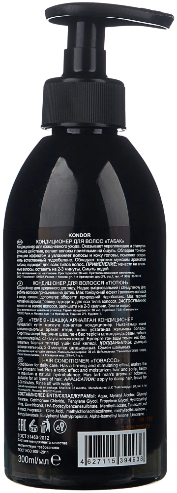 Обладает тонизирующим эффектом и увлажняет волосы и кожу головы, помогает сохранить естественный гидробаланс. Обладает терпким мужским ароматом табака, подходит для всех типов волос. Прекрасно сочетается со всеми шампунями Kondor.