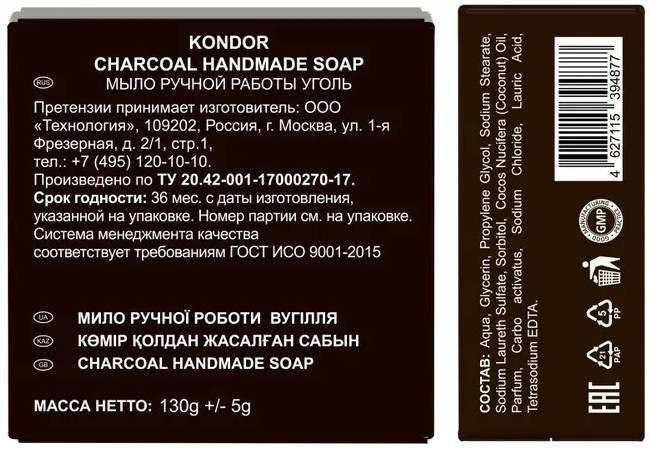 KONDOR Hair&Body Мыло ручной работы Уголь 130г+/-5г