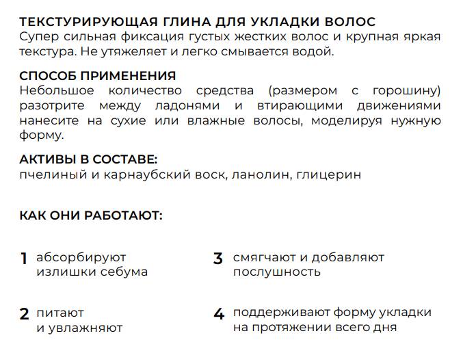 Глина для укладки густых и жестких волос без эффекта утяжеления. Средство обеспечивает супер сильную фиксацию на целый день и крупную текстуру. Эффективно абсорбирует излишки себума, надолго поддерживая чистоту и свежесть. Пчелиный воск в составе фиксирует укладку, карнаубский воск – усиливает фиксацию и добавляет яркой текстуры, что особенно важно для густых волос. Ланолин увлажняет и защищает, предотвращая пересыхание. Глицерин смягчает и добавляет послушность. Легко смывается водой.
