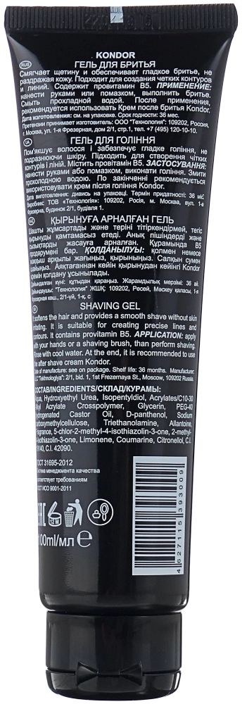 KONDOR Гель для бритья " SHAVING GEL" Прозрачный гель для бритья. Увлажняет и смягчает щетину, обладает антимикробными и противоспалительными свойствами. Легко наноситься и позволяет бритве скользить по коже более деликатно, минимизируя риск порезов. Предотвращает раздражение после бритья. Идеален для выполнения точных контуров и линий. Активные компоненты: провитамин В5, гидрованс, аллантоин.