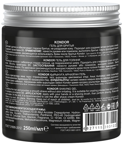 KONDOR Гель для бритья " SHAVING GEL" Прозрачный гель для бритья. Увлажняет и смягчает щетину, обладает антимикробными и противоспалительными свойствами. Легко наноситься и позволяет бритве скользить по коже более деликатно, минимизируя риск порезов. Предотвращает раздражение после бритья. Идеален для выполнения точных контуров и линий. Активные компоненты: провитамин В5, гидрованс, аллантоин.