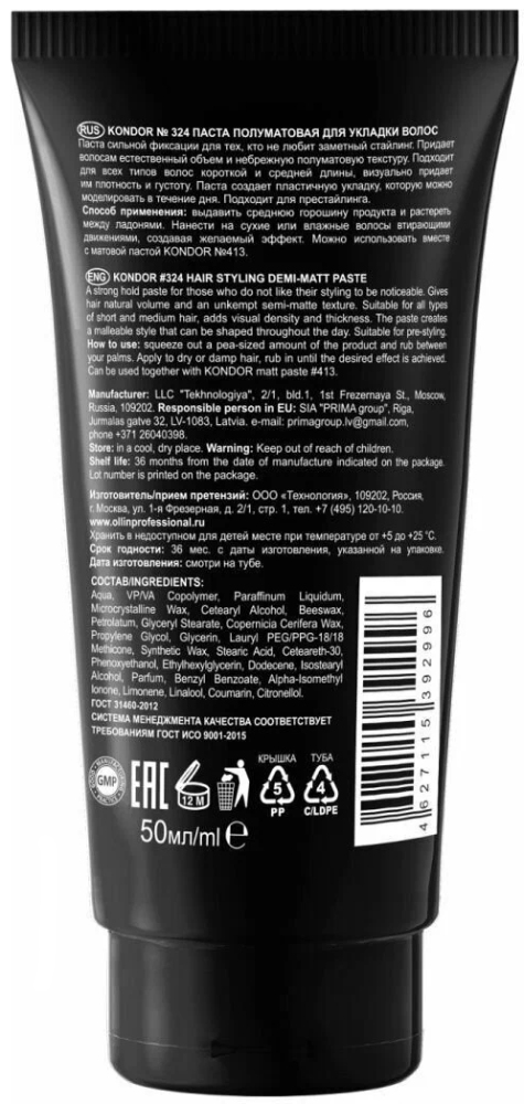 Полуматовая паста для укладки волос. Эластичная паста сильной фиксации на водной основе. Идеально подходит для создания и выделения текстуры на коротких и средних волосах. Создает гибкие, подвижные формы без эффекта склеивания волос. Активные компоненты: карнаубский воск.