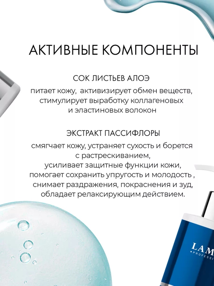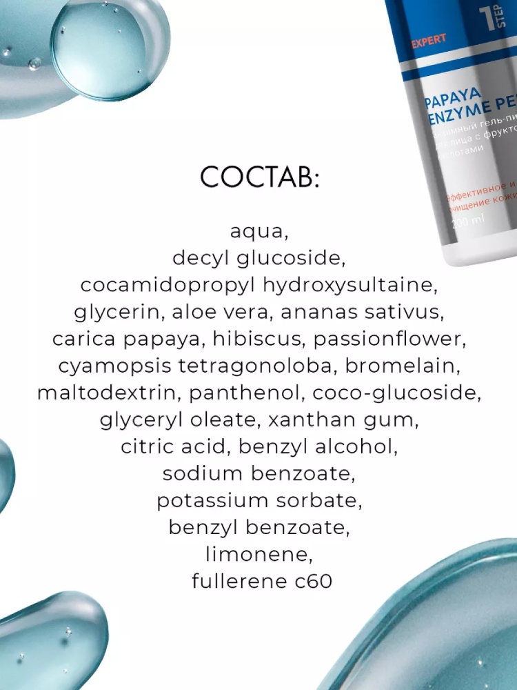 Фруктовые кислоты эффективно очищают, обновляют и смягчают кожу. Ферменты ананаса растворяют и удаляют верхний ороговевший слой кожи. Экстракты пассифлоры, папайи обладают питательным и противовоспалительным эффектом. Алоэ позволяет избежать дегидратации во время процедур. Гипоаллергенная формула геля стабилизирует рН, устраняет сухость, шелушение и выравнивает тон кожи.