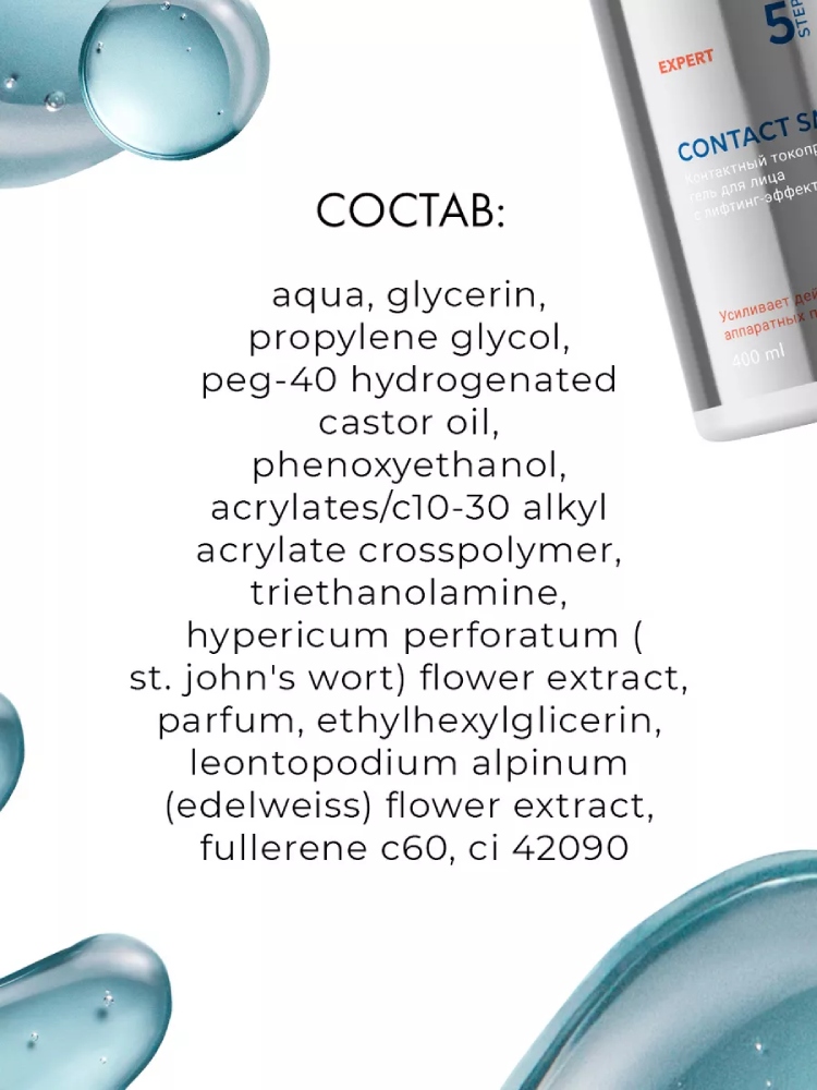 Предназначен для процедур с использованием методов лазерной и RF коррекции, миостимуляции, микротоковой терапии. Обеспечивает глубокое проникновение действующих веществ. Усиливает лифтинг-эффект процедур. Средство на основе экстрактов эдельвейса альпийского, зверобоя и стеарат сахарозы обеспечивает оптимальное скольжение, облегчает проникновение активных ингредиентов. Идеально подходит в качестве контактной среды для анти-эйдж процедур. Оказывает мощный антиоксидантный эффект, успокаивает и минимизирует возможные кожные реакции на аппаратное воздействие.