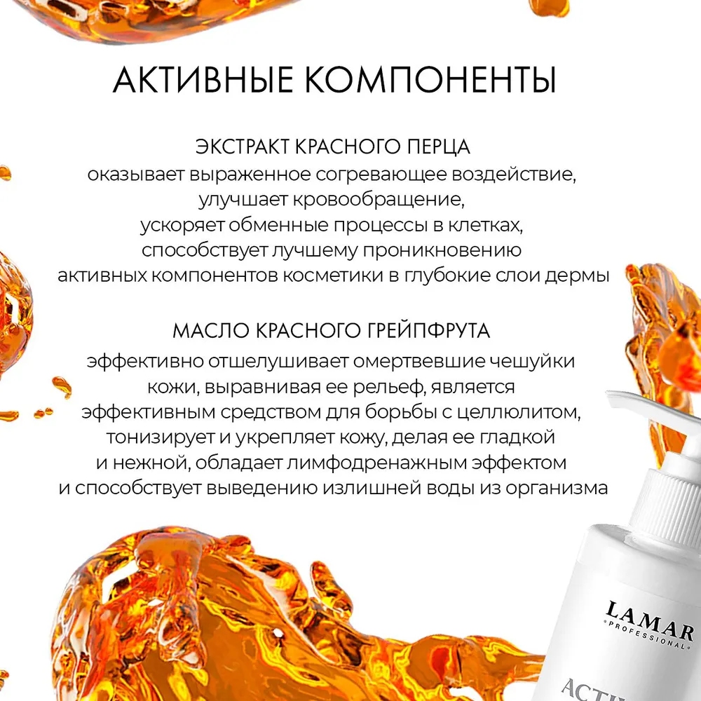 Массажное разогревающее масло для коррекции контура тела 5 в 1: антицеллюлитный, лимфодренажный, моделирующий и лифтинг эффект, борется с растяжками. Подходит для ручного массажа, массажа вакуумной банкой и обертывания. Идеально для борьбы с апельсиновой коркой, устранения растяжек после беременности, уменьшения объемов тела. Натуральные растительные компоненты обеспечивают питательное и увлажняющее действие. Разогревающий комплекс в сочетании с эфирным маслом корицы и экстрактом красного перца мощно стимулирует кровообращение и выводит лишнюю жидкость. Эфирное масло грейпфрута возвращает коже упругость и эластичность.