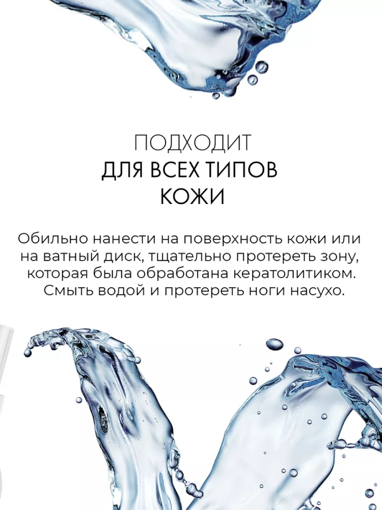 Обильно нанести на поверхность кожи или на ватный диск, тщательно протереть зону, которая была обработана кератолитиком. Смыть водой и протереть ноги насухо.