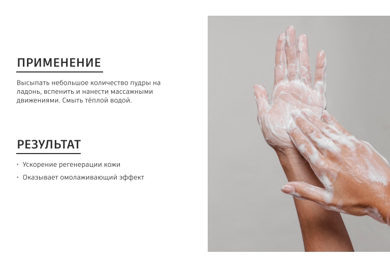 Высыпать небольшое количество пудры на ладонь, вспенить и нанести массажными движениями. Смыть тёплой водой. В период активного солнца рекомендуется дополнительно использовать средства с SPF.