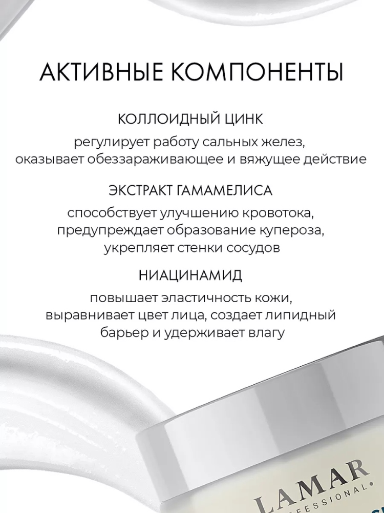 Моментально улучшает внешний вид кожи, абсорбируя излишки себума и снижая его секрецию. Коллаген разглаживает и выравнивает кожу, делает ее упругой и эластичной, убирает мелкие морщинки и освежает. Экстракт гамамелиса успокаивает и тонизирует, замедляет старение клеток. Входящий в состав цинк снижает вероятность появления несовершенств. Мочевина увлажняет, помогает укрепить барьерные функции эпидермиса. Маска оказывает регенерирующий эффект, питает и выравнивает цвет лица. Незаменима для жирной и проблемной кожи в качестве завершающей маски после косметологических процедур.