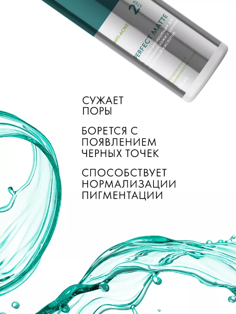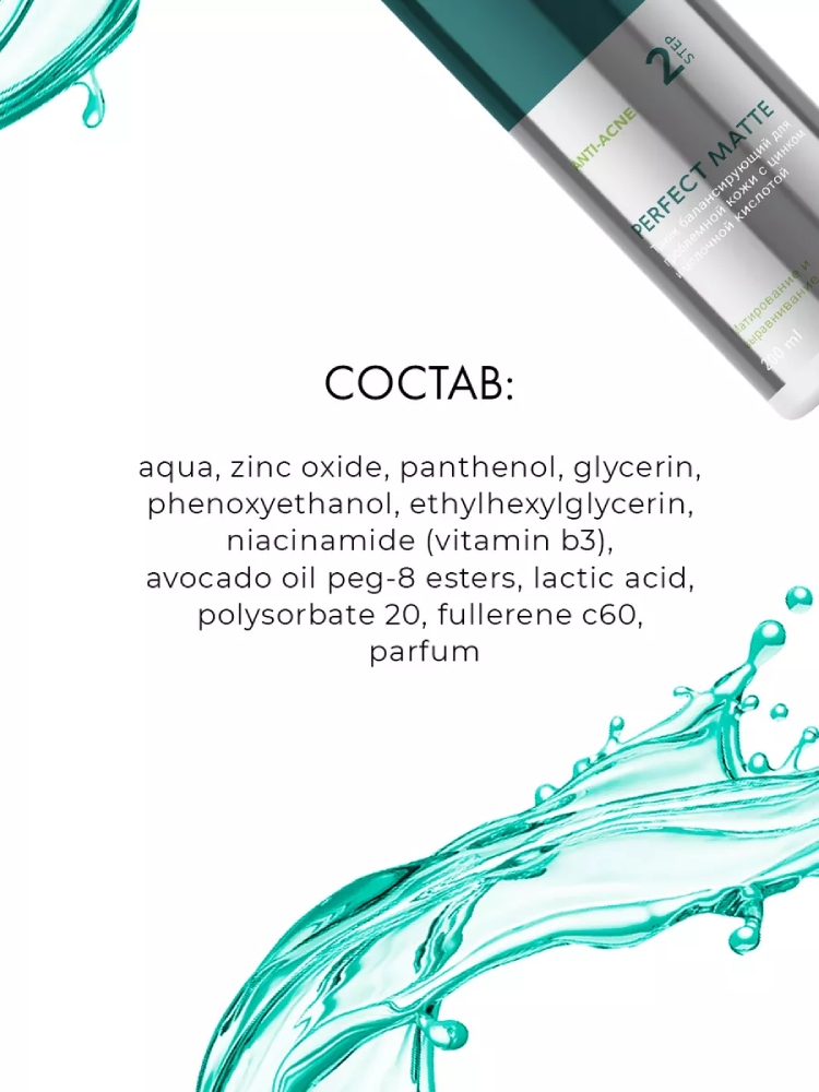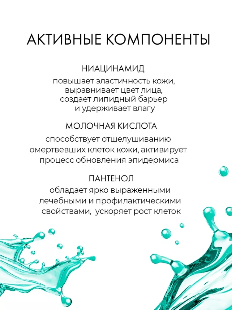 Контролирует и нормализует выработку себума, делая кожу матовой. Цинк способствует устранению черных точек и снижает вероятность появления акне. Ниацинамид способствует нормализации пигментации. Молочная кислота оказывает легкое отшелушивающее действие, выравнивает, успокаивает и улучшает тон кожи. Пантенол и масло авокадо обладают увлажняющим и разглаживающим действием, повышают эластичность кожи и ее тон.