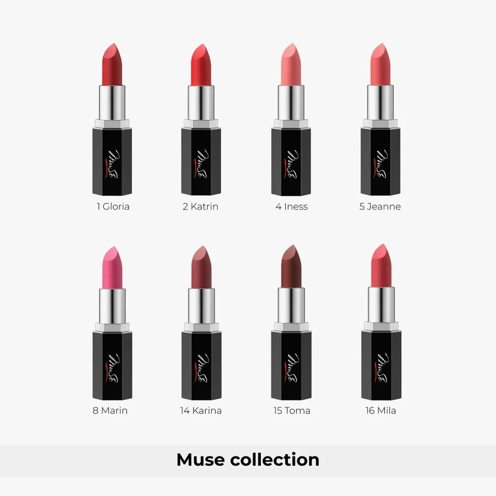 Коллекция помад Muse - создана, чтобы вдохновлять! 9 муз для вашей косметички - классическая коллекция глубоких интенсивных оттенков. Увлажняющая помада равномерно наносится и приобретает полуматовый финиш. Текстура имеет специально разработанную формулу, которая сочетает в себе лучшие качества увлажняющей и матовой помады. Особенности: - полуматовое покрытие - не сушит губы - стильная качественная упаковка