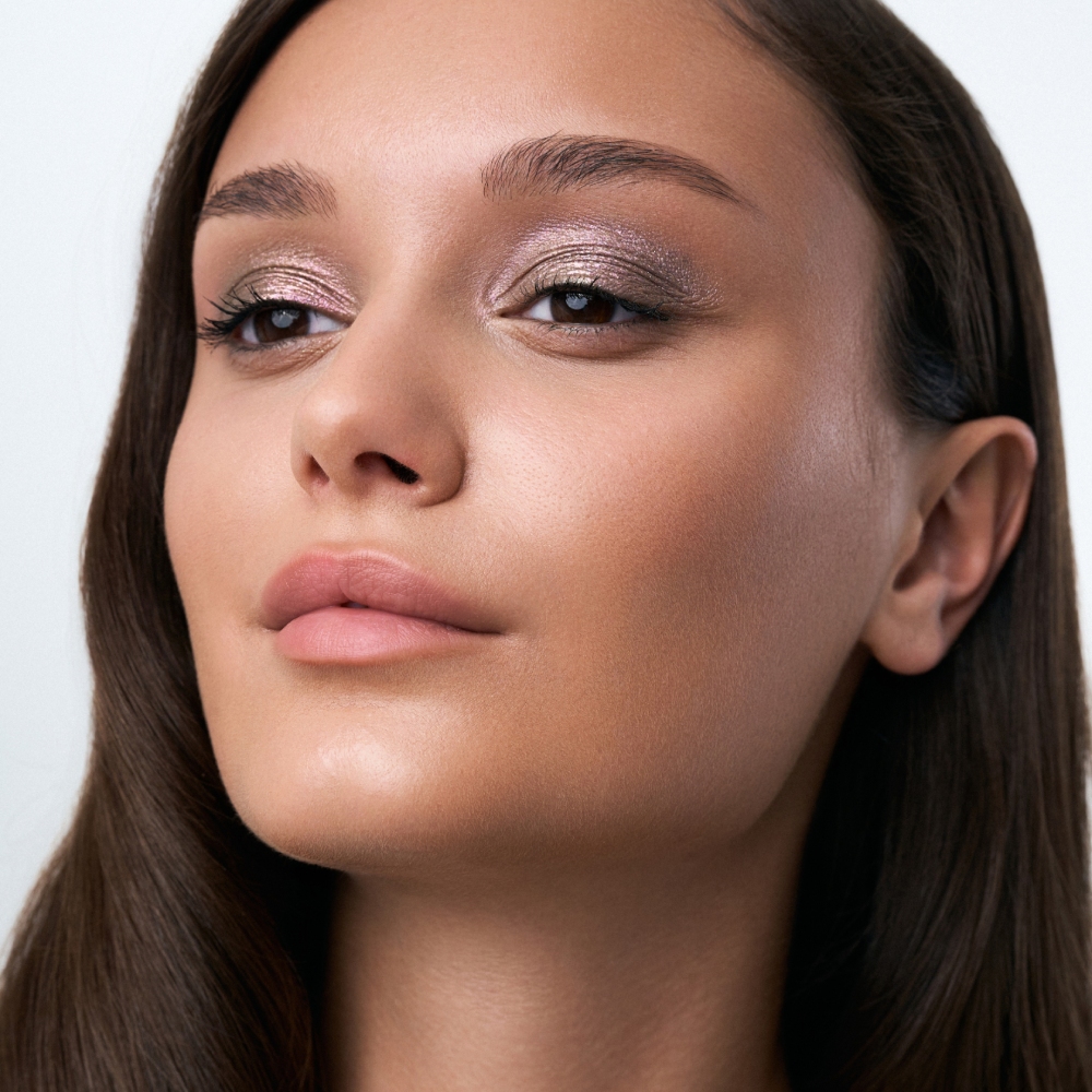 Наберите продукт плоской синтетической кистью или подушечками пальцев и нанесите тени-спарклы на поверхность кожи.