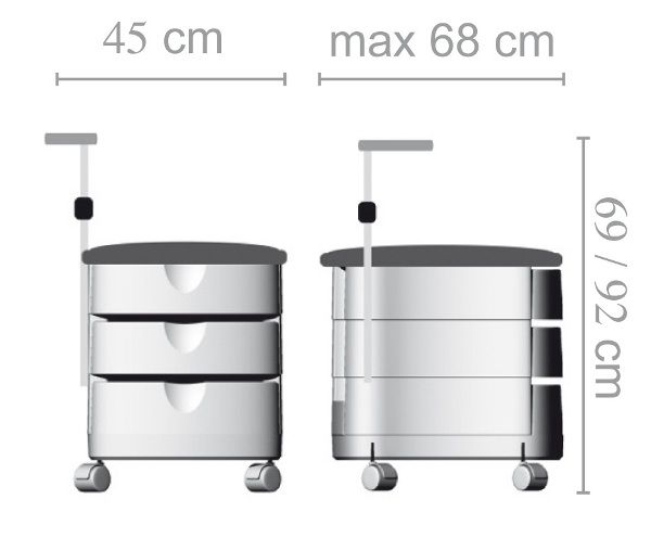 Стойка маникюрная на колесиках. Стойка маникюрная оснащена тремя выдвижными ящиками закрытого типа и специальной полочкой, которая регулируется по высоте. Каркас стойки выполнен из прочного пластика, мягкий элемент сиденья и рабочей полочки выполнен из искусственной кожи высшего качества. Возможные комплектации:72062 B - Цвет основания и ящиков: белый.72062 N - Цвет основания и ящиков: черный. Размер (ДхШхВ): 45х68х69-92 см. Производитель: Geriotti, Италия. Цена по запросу.