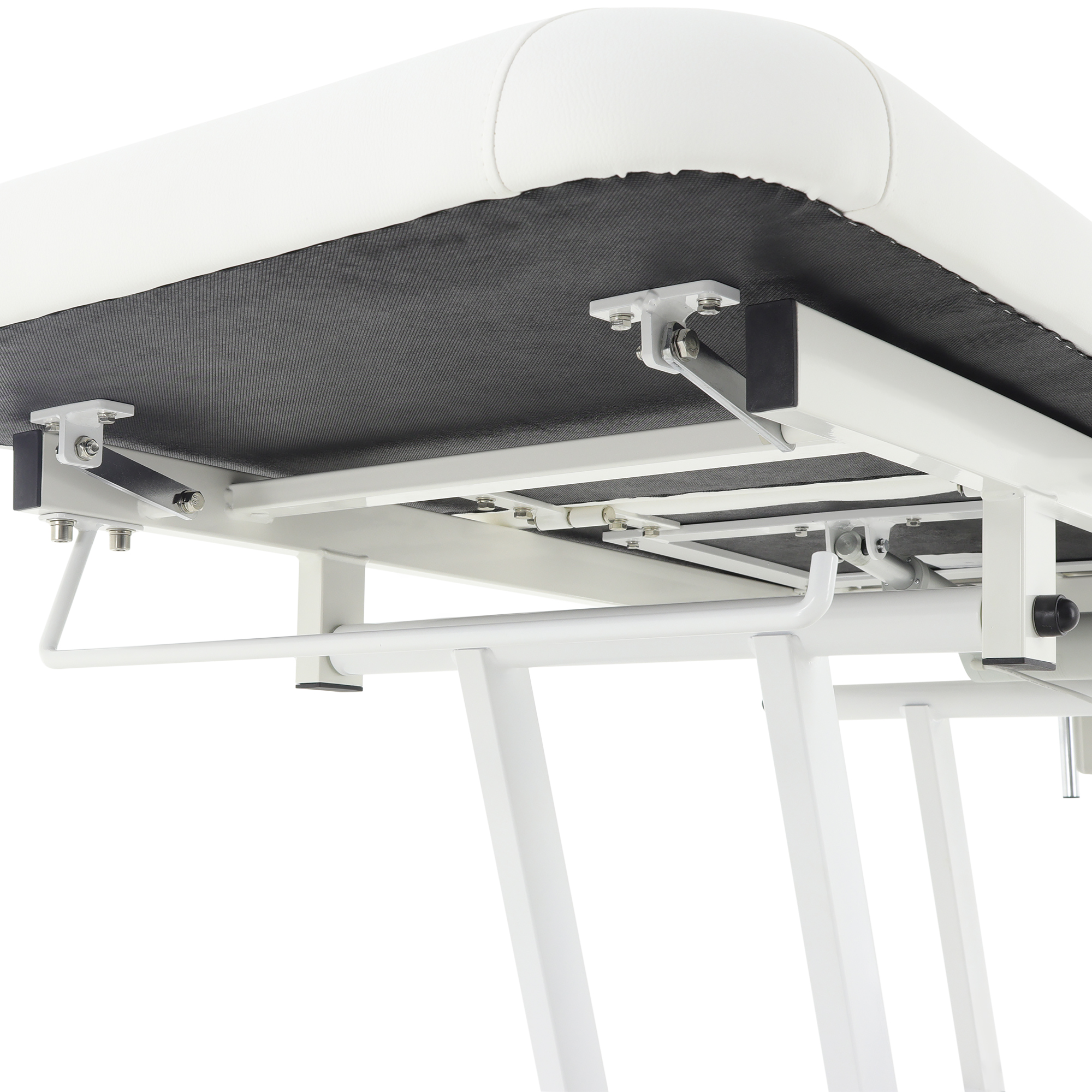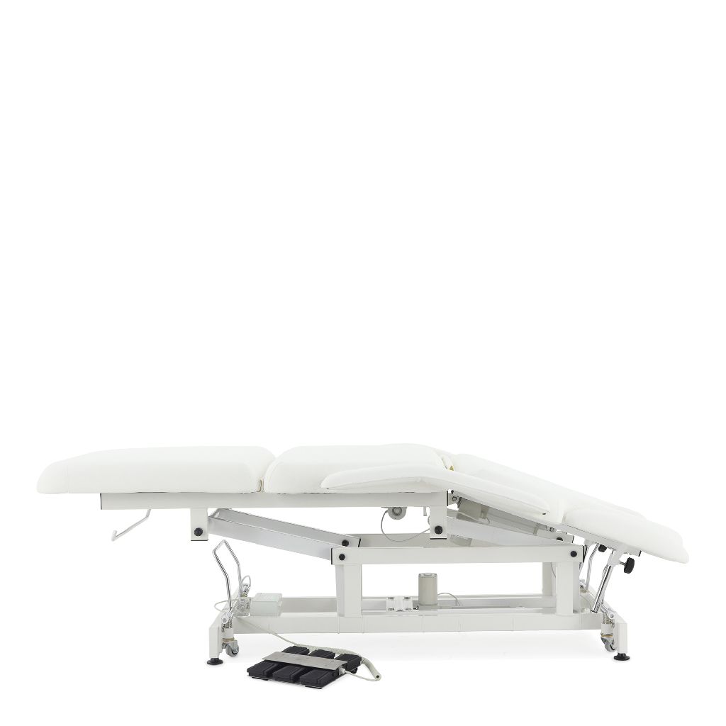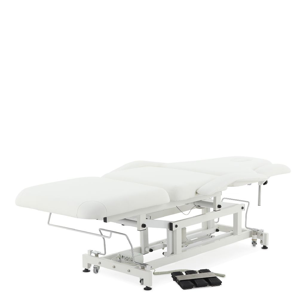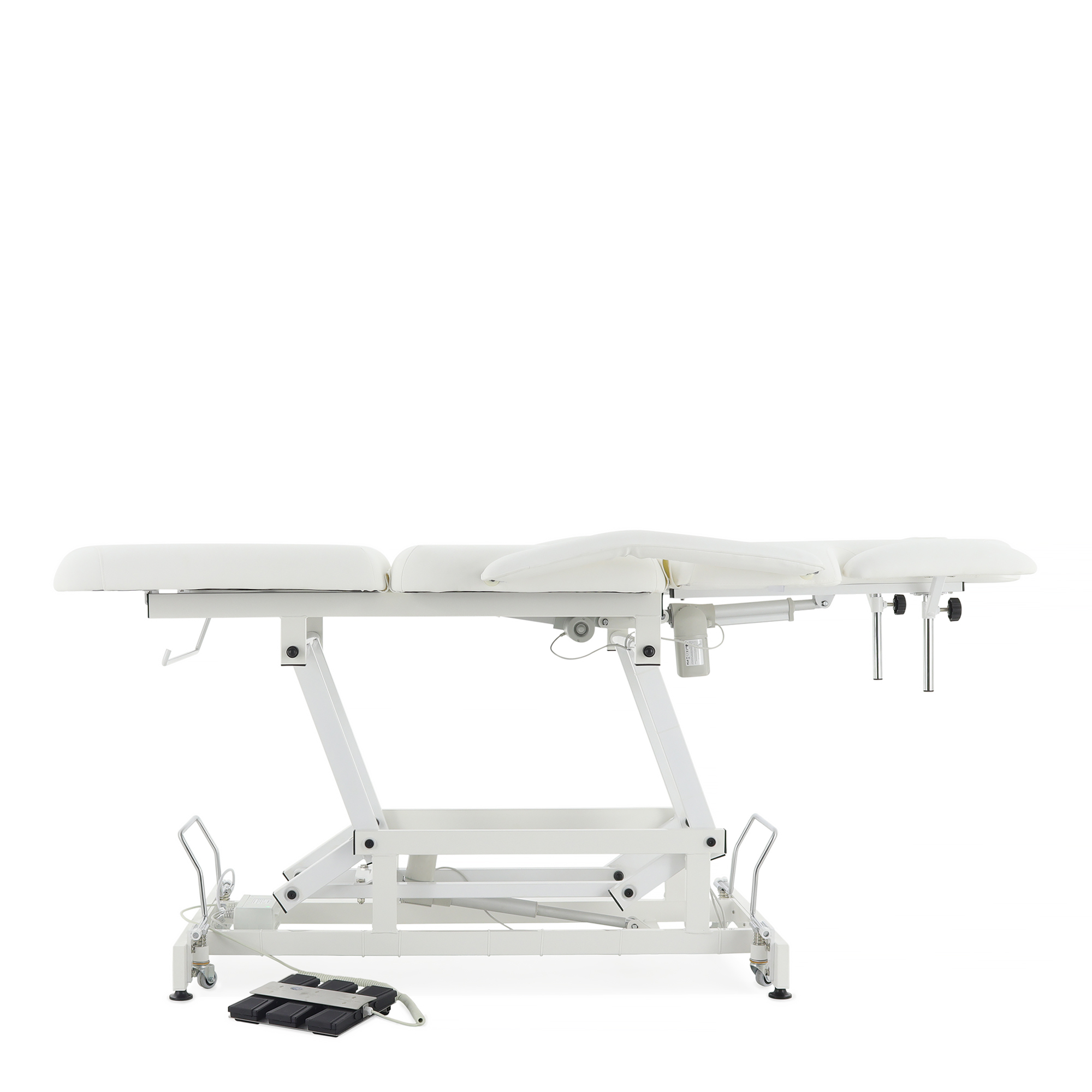Массажный стол MMKM-2 (SE3.21.10) — функциональность и удобство «в одном флаконе». Здесь есть все, что необходимо специалисту, чтобы сделать процедуру максимально комфортной для пациента и удобной для себя. Рама изготовлена из прочной стали, выдерживает повышенную нагрузку. Специальная обработка позволяет значительно повысить ее устойчивость к коррозийным процессам. Поэтому ее можно без риска обрабатывать любым моющим средством (но быть осторожными с чересчур агрессивными). Кроме того, есть возможность самостоятельно регулировать высоту с помощью электропривода, работающего от пульта дистанционного управления. Ложемент представляет собой каркас, с увеличенной по толщине поролоновой прослойкой. Сверху — качественный винил-люкс, устойчивый к истиранию и мелким механическим повреждениям. Уход за ним не потребует больших затрат времени и сил. Ложе разделено на три секции, две из которых (спинная и тазобедренная) могут менять свой угол наклона с помощью того же электрического привода. Регулируемый массажный стол