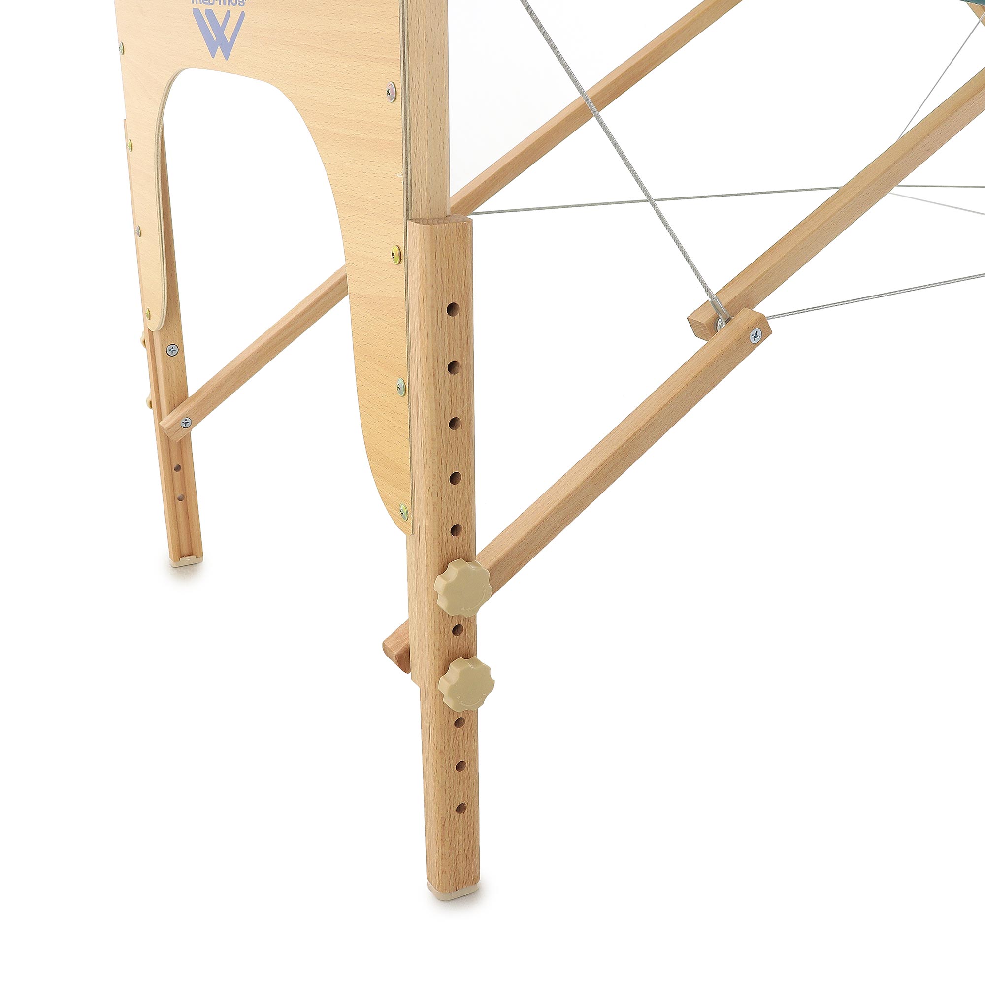 Раскладной массажный стол JF-AY01 может быть использован как стационарно, так и «на выезде». За счет компактности в сложенном виде и небольшого веса (всего 17,8 кг) не возникнет никаких проблем с его хранением и транспортировкой. Ложемент разделен на три секции, одна из которых может менять угол наклона, тем самым расширяя список возможных процедур. Особенно актуально это для тех, кто страдает сильными отеками нижних конечностей. Возможность регулировка по высоте в диапазоне 61-85 см. Это очень важная функция, поскольку слишком высокое положение создаст дискомфорт специалисту, а эффективность сеанса значительно пострадает. Кроме того, невозможность отрегулировать высоту сильно ограничивает список доступных процедур. Каркас выдерживает нагрузку в 270 кг (статическая — достигает 600 кг), а сам он изготовлен из натурального дерева с лаковым покрытием, значительно увеличивающим срок его эксплуатации. Поролоновая 4-сантиметровая прослойка и мягкая ткань обивки делают сеансы массажа еще более комфортными для пациен