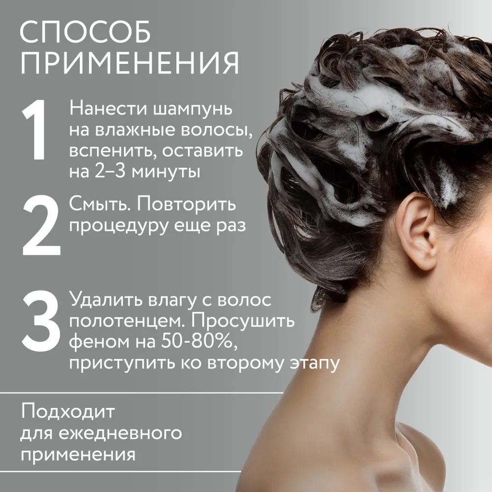 Нанести восстанавливающий шампунь на влажные волосы, вспенить, оставить на 2-3 минуты. Смыть. Повторить процедуру еще раз. Удалить влагу с волос полотенцем. Просушить феном на 50-80%, приступить ко второму этапу.