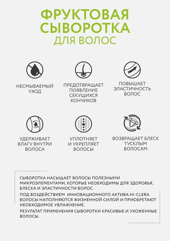 Сыворотка фруктовая для волос PERFECT HAIR FRESH MIX насыщает волосы полезными микроэлементами, содержащимися в экстрактах яблока, киви, винограда, которые необходимы для здоровья, блеска и эластичности волос. В сочетании с инновационным активом Hi-Clera волосы наполняются жизненной силой и приобретают необходимое увлажнение. Результат применения сыворотки - красивые и ухоженные волосы.