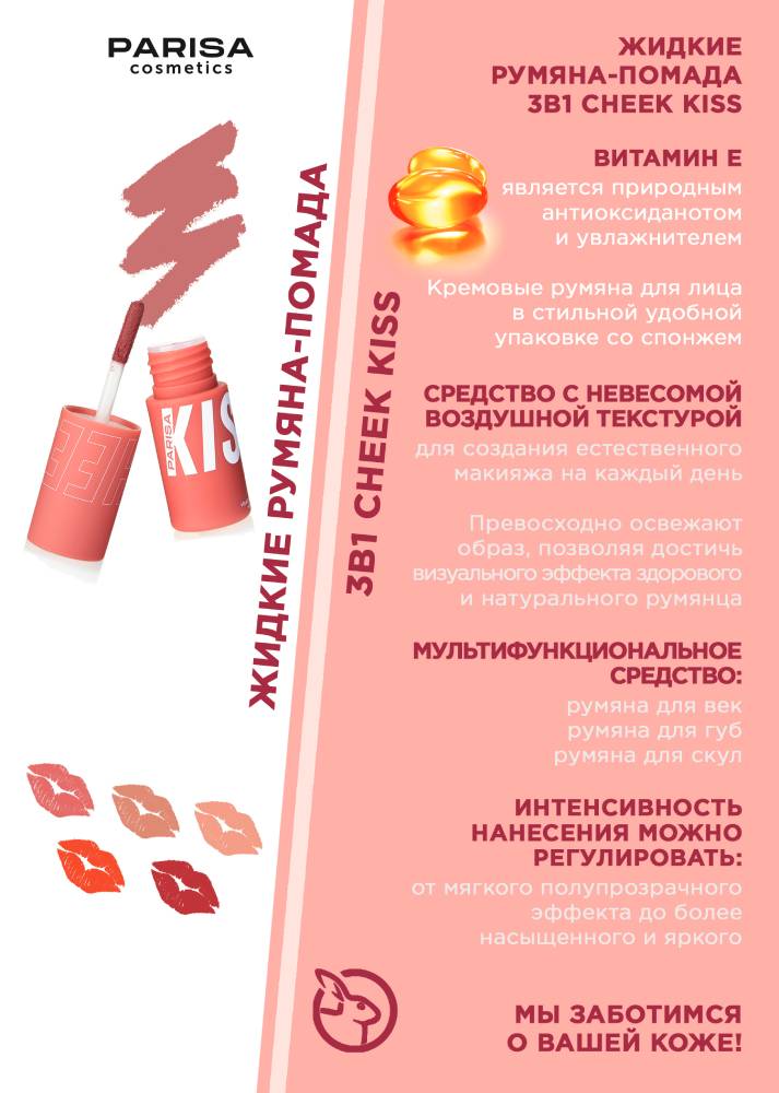 Стойкие румяна для лица Cheeky Kisses — косметическое средство с невесомой, воздушной текстурой для создания естественного макияжа на каждый день. Жидкие румяна превосходно освежают образ и позволяют достичь визуального эффекта здорового и натурального румянца. Средство легко наносится и растушевывается на коже. Это мультифункциональное средство 3 в 1 для макияжа — его можно использовать как румяна для век, помаду для губ и румяна для лица. Интенсивность нанесения можно регулировать: от мягкого полупрозрачного эффекта до более насыщенного и яркого.