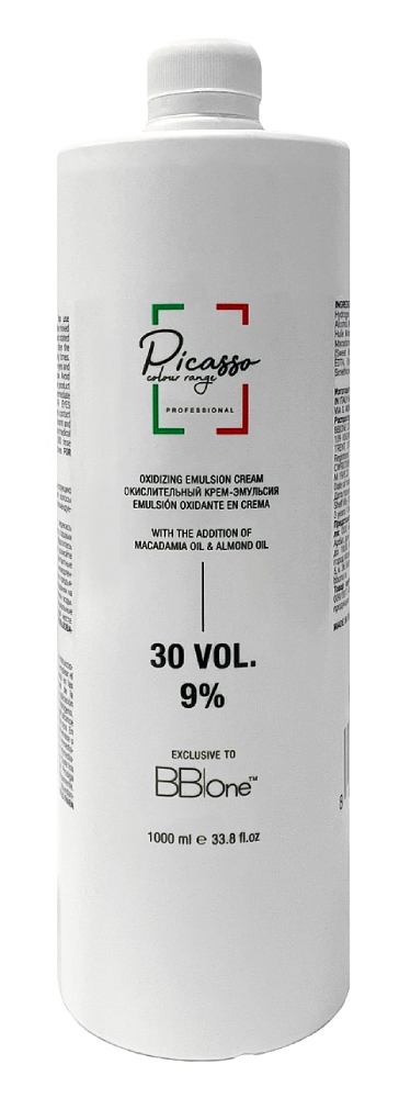 Оксидант Picasso содержит масло сладкого миндаля, масло макадамии, что делает процедуру окрашивания максимально щадящей, дает дополнительный уход волосам во время окрашивания.