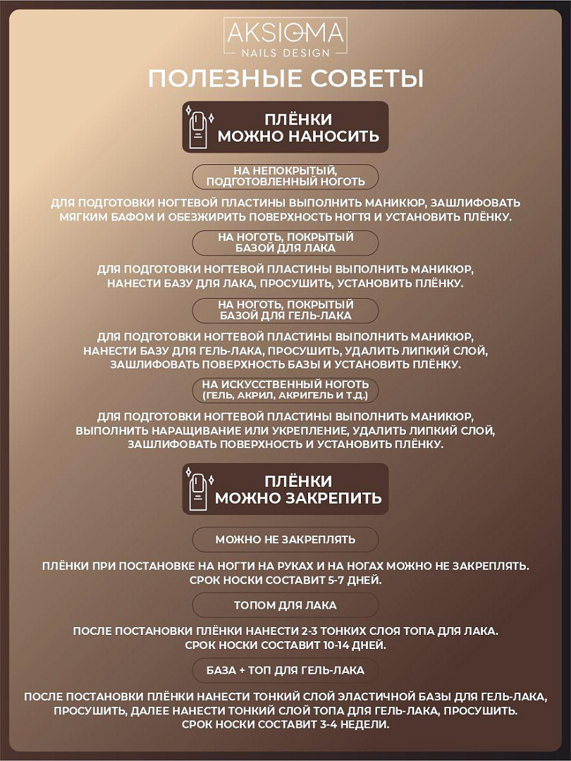 Пленки - альтернатива гель - лака. Пленки можно наносить: 1. На непокрытый, подготовленный ноготь. Для подготовки ногтевой пластины выполнить маникюр, зашлифовать мягким бафом, обезжирить поверхность ногтя и установить пленку. 2. На ноготь, покрытый базой для лака. Для подготовки ногтевой пластины выполнить маникюр, нанести базу для лака, установить пленку. 3. На ноготь, покрытый базой для гель-лака. Для подготовки ногтевой пластины выполнить маникюр, нанести базу для гель-лака, просушить, удалить липкий слой, зашлифовать поверхность баз и установить пленку. 4. На искусственный ноготь (акрил, гель, акригель). Для подготовки ногтевой пластины выполнить маникюр, выполнить наращивание или укрепление, удалить липкий слой, зашлифовать поверхность и установить пленку. Закрепление пленки: 1. Не закреплять. Пленки при постановке на ногти на руках и на ногах можно не закреплять. Срок носки 5-7 дней. 2. Топом для лака. После постановки пленки нанести 2-3 тонких слоя топа для лака. срок носки 10-14 дней. 3. Ба