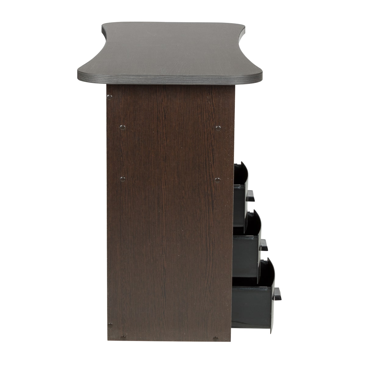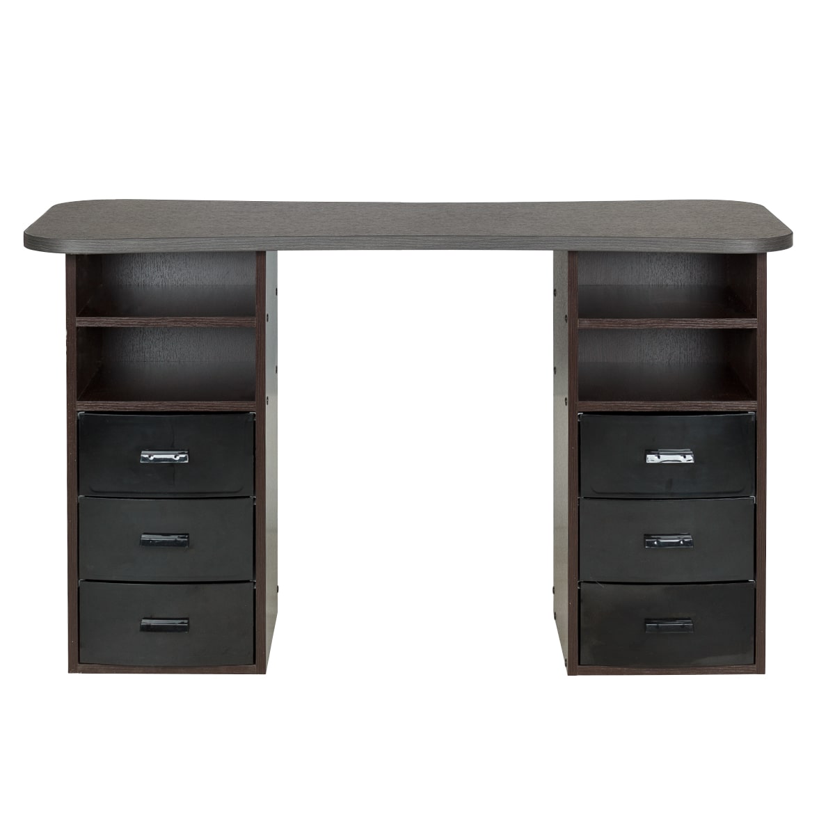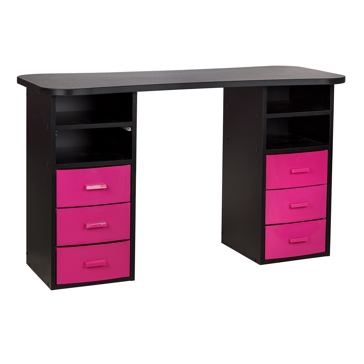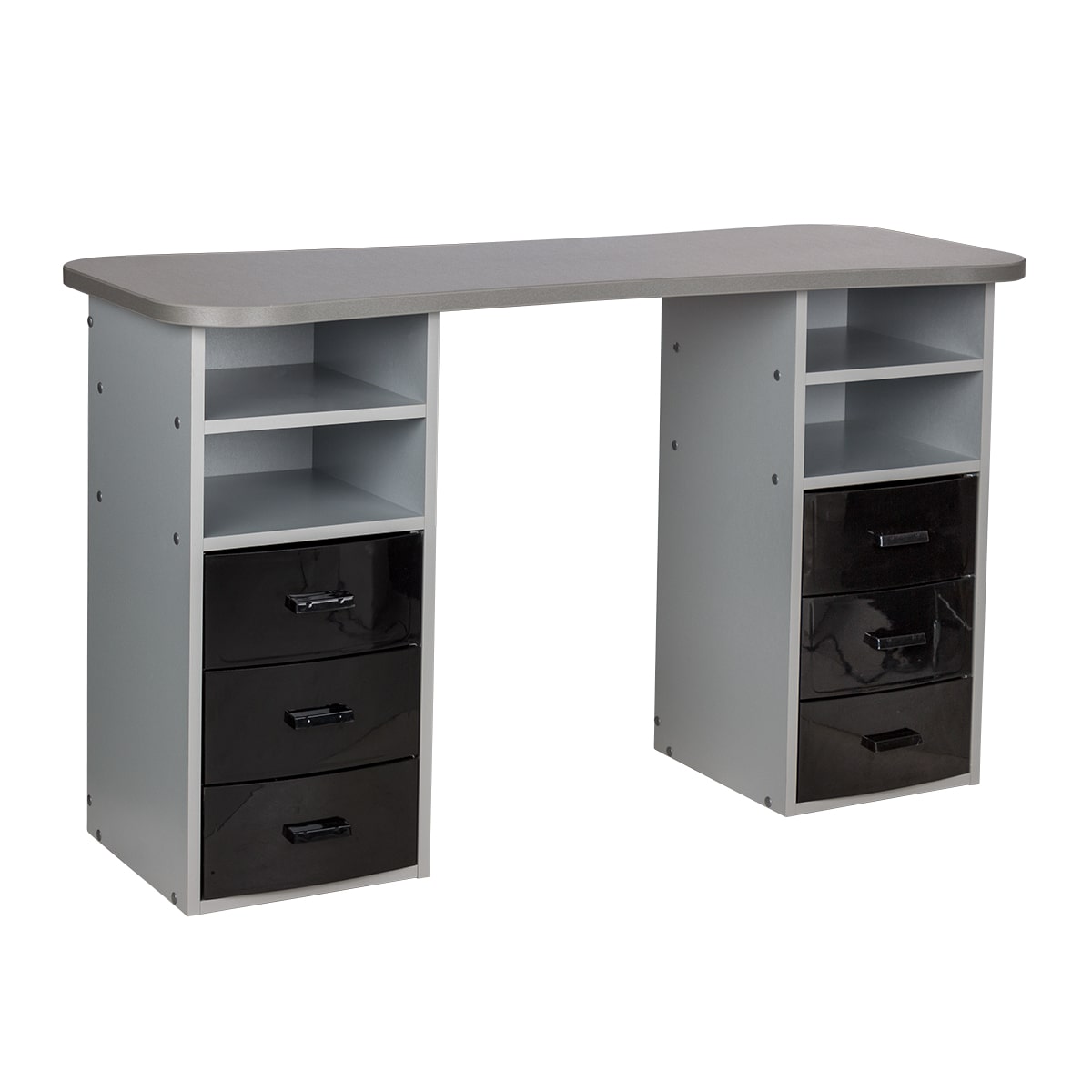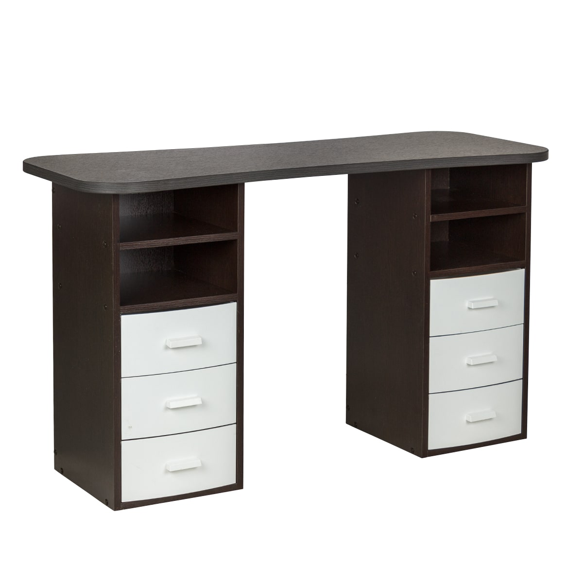 Стол маникюрный Элвуд 3 Производитель: МЭДИСОНКомплектация: две тумбы, шесть ящиков, две полки, столешница Характеристики: Столешница: износостойкая ЛДСП с ПВХ кромкой Каркас тумбы: влагостойкая ламинированная ДСП Ящики: съемные, пластиковые, 6 штук Полки: ламинированная ДСП, открытые, 4 штуки Цвета ящиков: салатовый, розовый, черный, фиолетовый, белый Практичный стол маникюрный Элвуд 3 поможет грамотно разделить рабочее пространство и повысить эффективность мастеров. Сдержанный стиль маникюрного стола выгодно подчеркнет интерьер бьюти салона. Столешница с плавными изгибами открывает легкий доступ к рукам клиента. На широких краях закругленной формы мастер может поставить аппарат, инструменты и расходные материалы. Под столешницей есть две тумбы по две ниши и по три ящика в каждой. При необходимости ящики можно вынимать. Маникюрное оборудование изготавливается с применением качественных материалов и фурнитуры. Столешница, полки и корпус тумбы изготовлены из влагостойкой ЛДСП. Ящики выполнены из выс