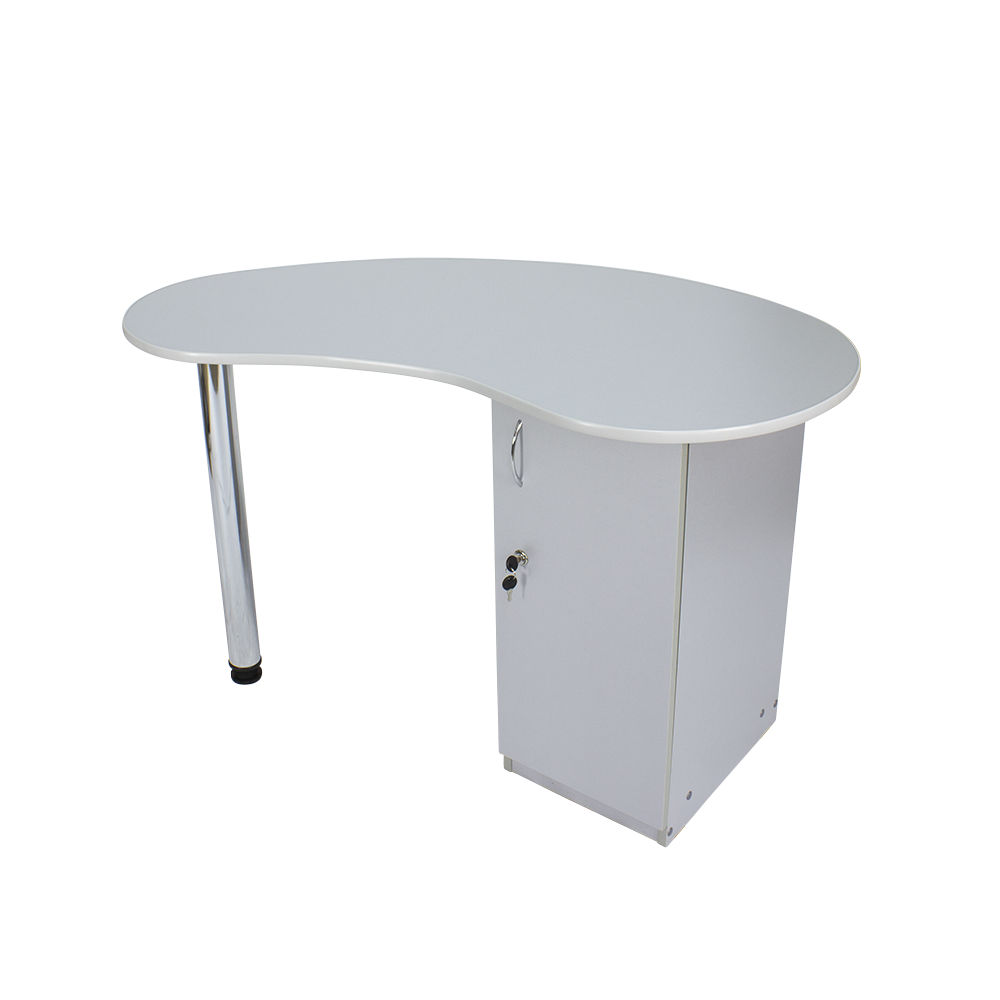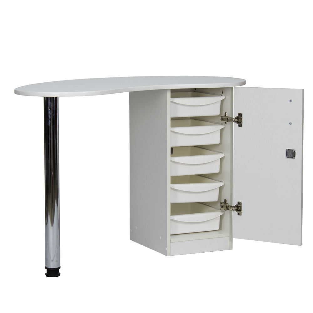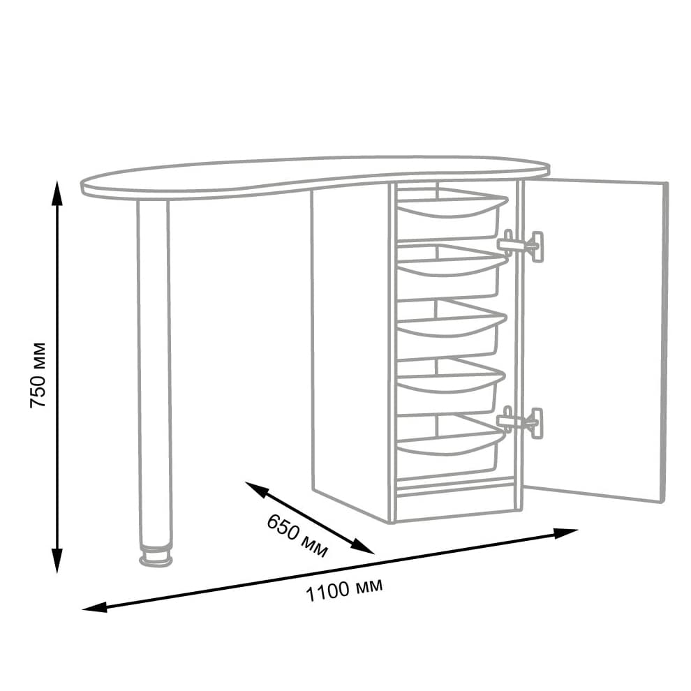 Производитель: Компания МЭДИСОН.Комплектация: столешница, тумба с ящиками под ключ, ножка на опоре. Характеристики: Столешница: износостойкая ЛДСП с защитной окантовкой против влаги. Тумба: ЛДСП с влагостойкими свойствами. Ящики: прочный пластик, 5 штук. Цвет ящиков: белый, зеленый, оранжевый, красный, фиолетовый, серый, черный. Ножка: из прочной хромированной стали, на подпятнике. Маникюрный стол КАТРИН Next станет функциональным дополнением рабочего места и стильной частью интерьера салона красоты. Столешница имеет форму капли. На широкой стороне столешницы мастер может поставить аппараты для маникюра, стойку с лаками, лампу и прочие аксессуары. Узкая сторона открывает легкий доступ к рукам клиента. С вместительными ящиками каждый предмет для маникюра будет лежать на своем месте. Переместить стол не потребует особых усилий, ведь под тумбой есть встроенные маневренные колеса. Столешница и тумба изготовлены из качественной ЛДСП. Материал устойчив к воздействию химических веществ и ежедневная чистк