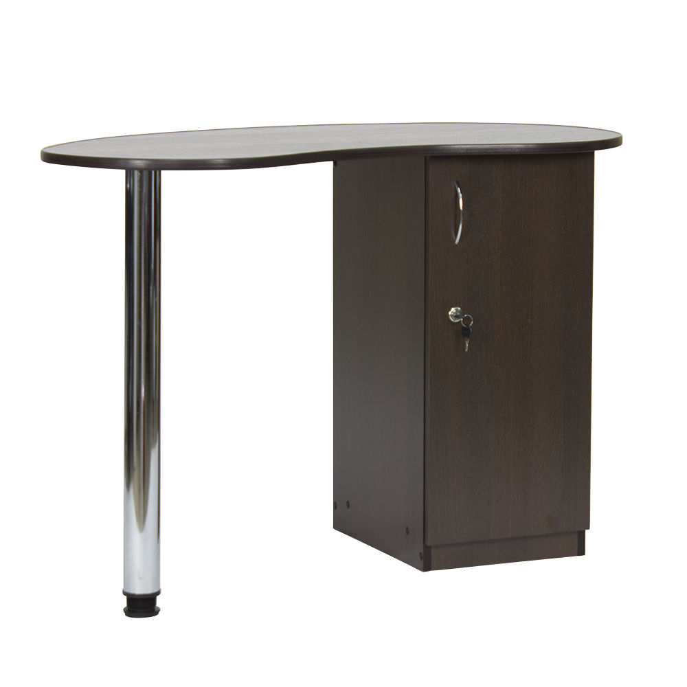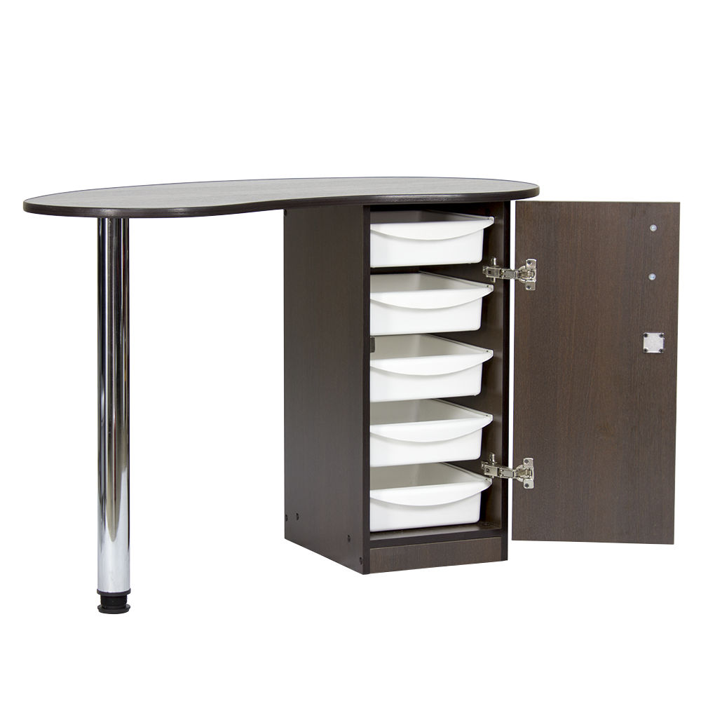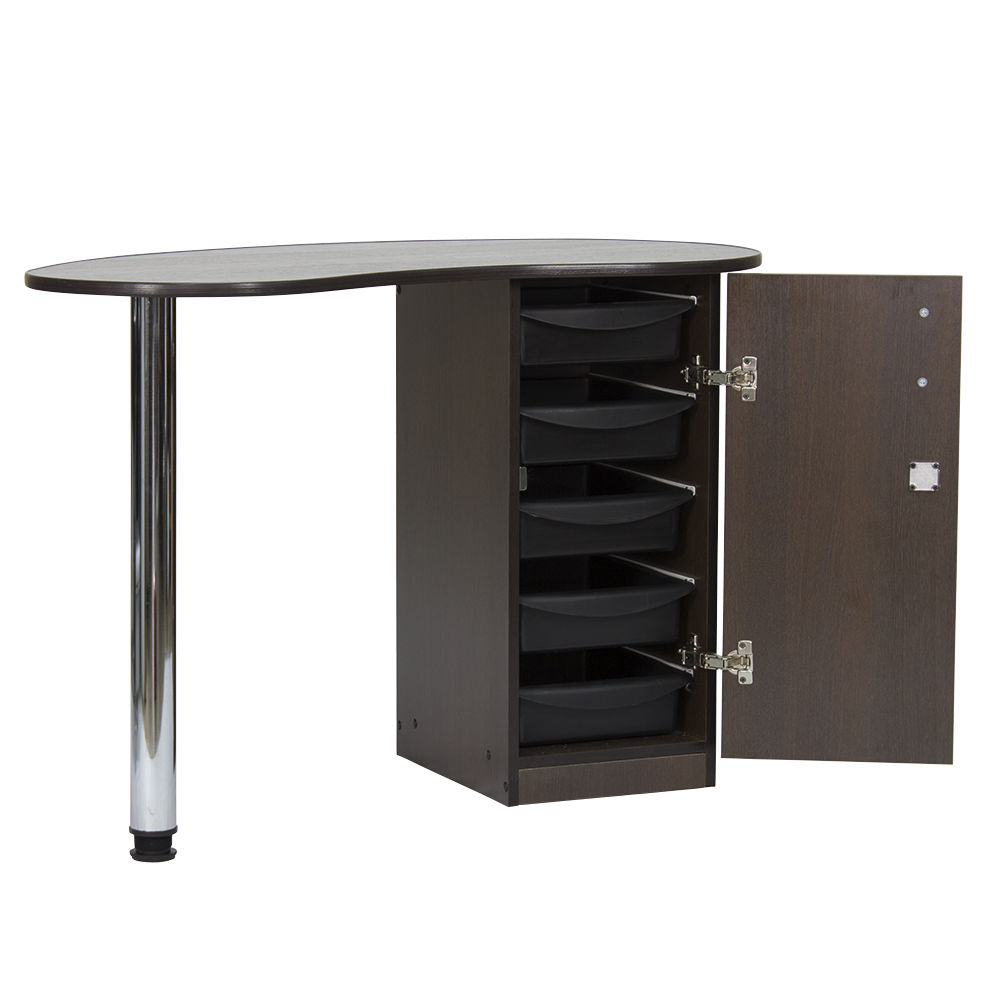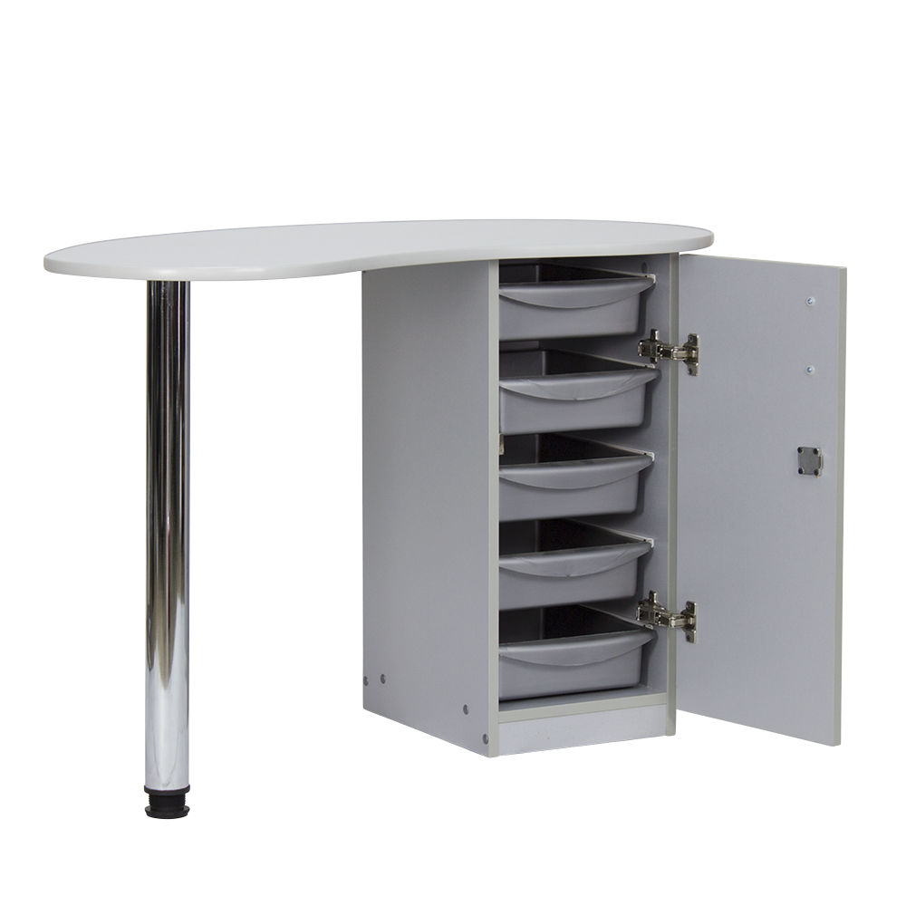 Производитель: Компания МЭДИСОН.Комплектация: столешница, тумба с ящиками под ключ, ножка на опоре. Характеристики: Столешница: износостойкая ЛДСП с защитной окантовкой против влаги. Тумба: ЛДСП с влагостойкими свойствами. Ящики: прочный пластик, 5 штук. Цвет ящиков: белый, зеленый, оранжевый, красный, фиолетовый, серый, черный. Ножка: из прочной хромированной стали, на подпятнике. Маникюрный стол КАТРИН Next станет функциональным дополнением рабочего места и стильной частью интерьера салона красоты. Столешница имеет форму капли. На широкой стороне столешницы мастер может поставить аппараты для маникюра, стойку с лаками, лампу и прочие аксессуары. Узкая сторона открывает легкий доступ к рукам клиента. С вместительными ящиками каждый предмет для маникюра будет лежать на своем месте. Переместить стол не потребует особых усилий, ведь под тумбой есть встроенные маневренные колеса. Столешница и тумба изготовлены из качественной ЛДСП. Материал устойчив к воздействию химических веществ и ежедневная чистк