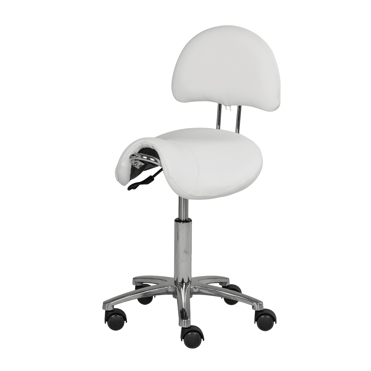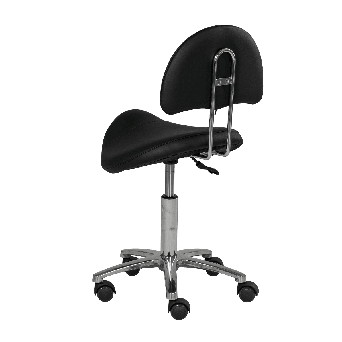 Производитель: КитайКомплектация: сиденье в форме седла, спинка, пятилучье на колесах Характеристики: Обивка: мягкая экокожа Наполнитель: эластичный поролон Регулировка: пневматика Колесики: пластик Стул-седло со спинкой МД-901А – удобное и стильное решение для специалистов, которые долгое рабочее время проводят в положении сидя. Современное и оригинальное парикмахерское оборудование гармонично впишется в интерьер салона красоты. Конструкция стула позволяет принять максимально естественную позу. Сидя на таком стуле легко держать спину ровно, благодаря четким точкам опоры. Стулья для мастеров предотвратят боли в спине, уменьшив нагрузку на позвоночник. Чтобы с легкостью перемещать оборудование, основание установлено на поворотные колесики. Для того, чтобы установить оптимальную высоту сиденья, предусмотрен пневматический механизм. Каркас изготовлен из прочного хромированного металла. Сталь устойчива к проявлению коррозии, не боится влияния влаги и косметических средств. Обивка выполнена из эко