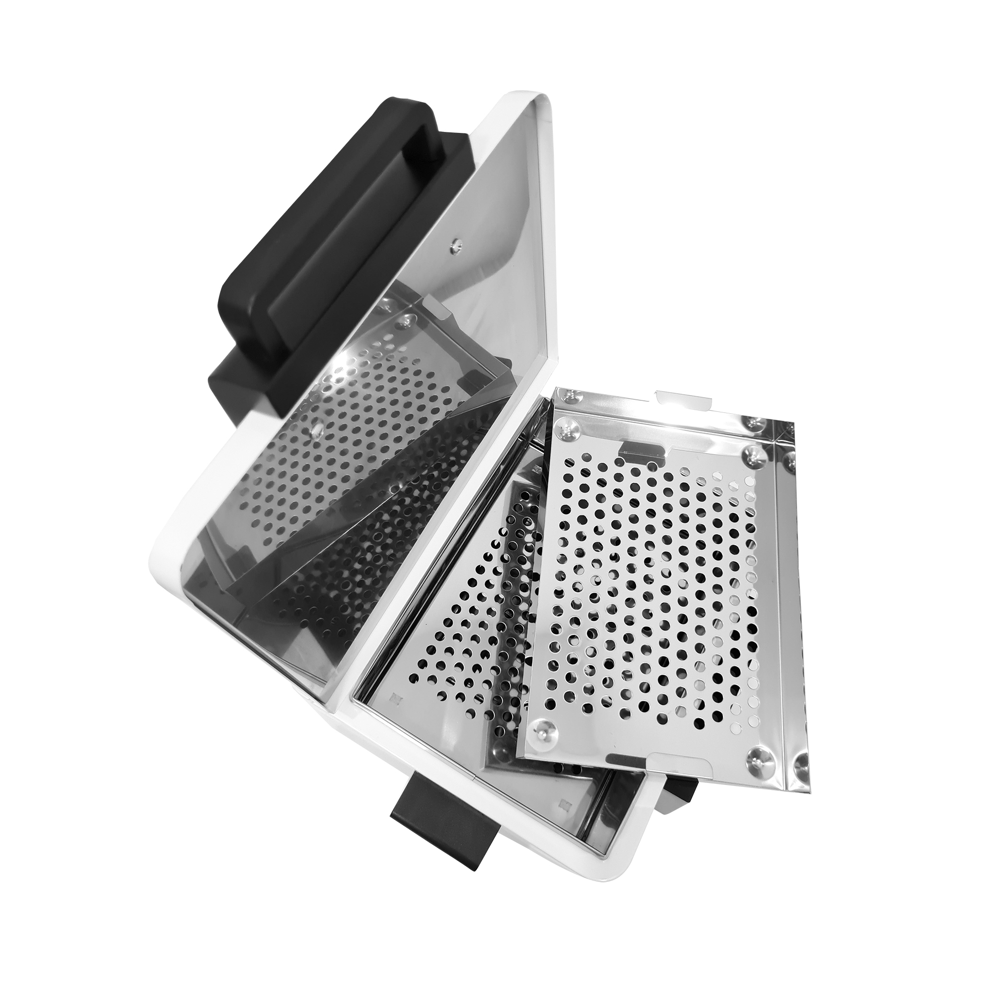 Сухожар SM-360C для стерилизации является профессиональным и изготовлен из высококачественных материалов. Он предназначен для стерилизации маникюрных, косметологических и парикмахерских инструментов. Стерилизация происходит за счет нагрева воздуха до высоких температур. Внешне сухожар выглядит очень стильно и станет украшением любого маникюрного кабинета или салона. - Имеет уникальный дизайн.- Внутри прибора есть специальный съемный контейнер для хранения и стерилизации инструментов.- Внутренний блок сухожара изготовлен из нержавеющей стали.- В комплекте имеются металлические ручки для удобного и безопасного вынимания контейнера.- Корпус сухожара оборудован двумя дисплеями (регулятор температуры и таймер).- Внутри крышка сухожара имеет зеркальную поверхность.- Компактный размер (поместится на любую поверхность).- Можно использовать крафт-пакеты.- Крышка сухожара оборудована пластиковой ручкой для удобного и безопасного открытия. Технические характеристики:Материал корпуса: металл и пластикНапряжение: 220-240