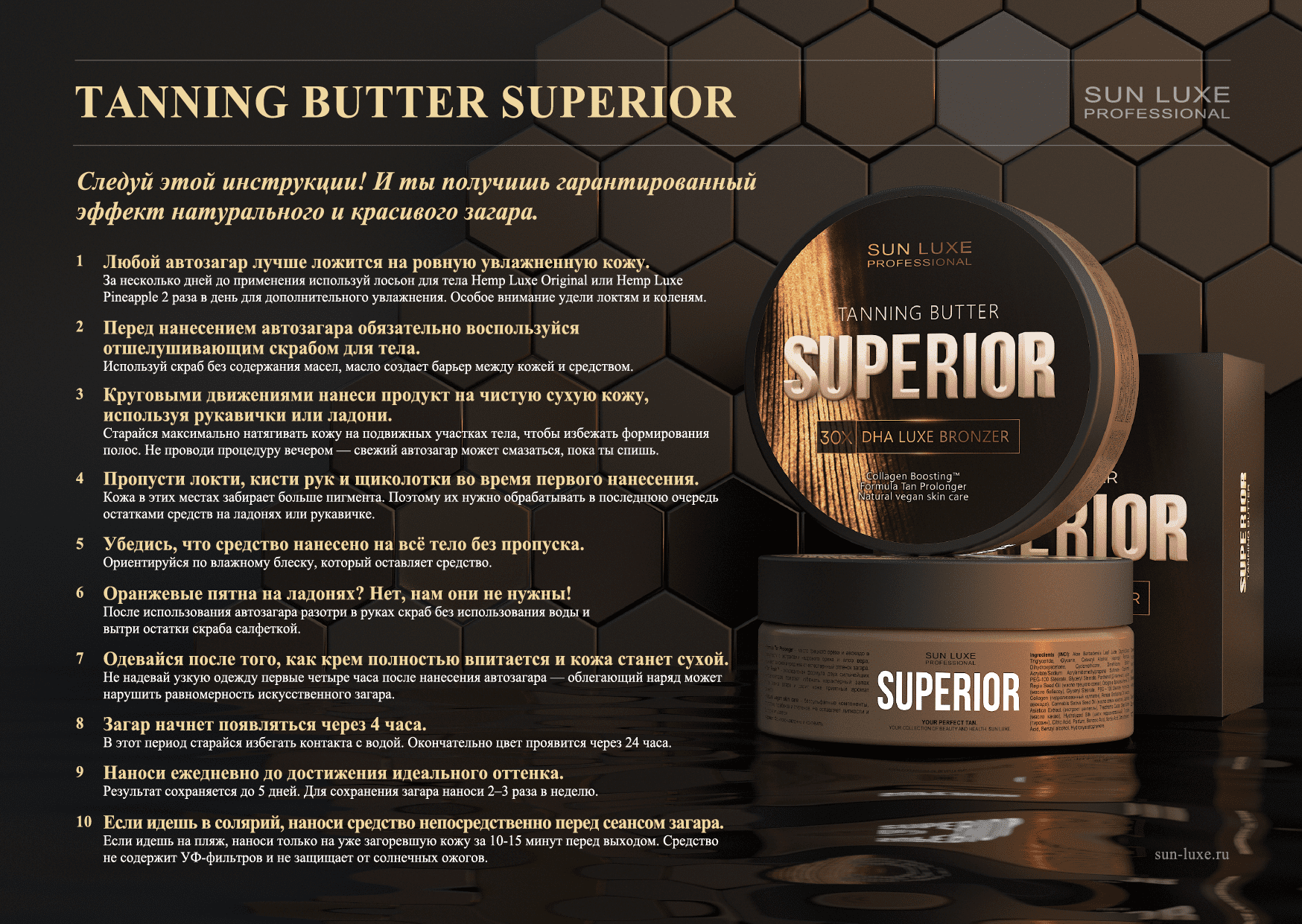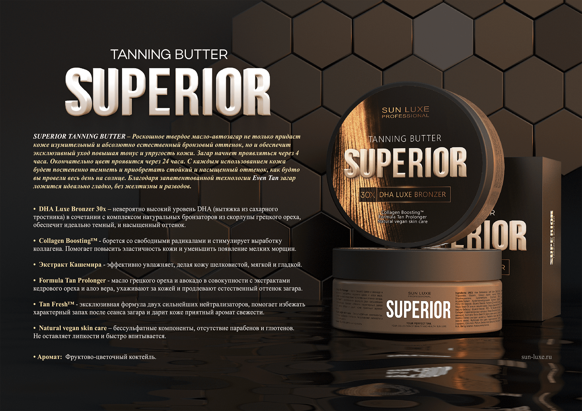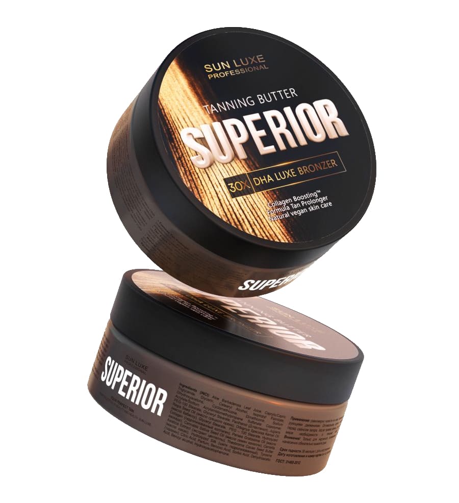 SUPERIOR TANNING BUTTER – роскошное твердое масло-автозагар не только придаст коже изумительный и абсолютно естественный бронзовый оттенок, но и обеспечит эксклюзивный уход, повышая тонус и упругость кожи. Загар начнет проявляться через 4 часа. Окончательно цвет проявится через 24 часа. С каждым использованием кожа будет постепенно темнеть и приобретать стойкий и насыщенный оттенок, как будто вы провели весь день на солнце. Благодаря запатентованной технологии Even Tan загар ложится идеально гладко, без желтизны и разводов.