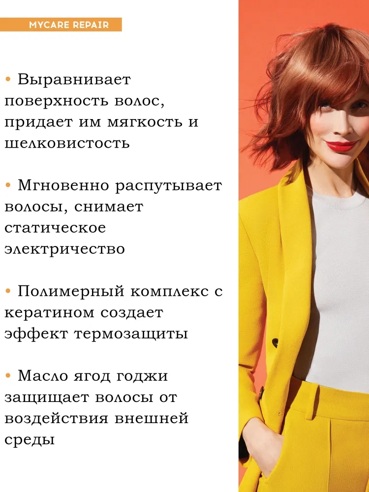 Незаменим при укладке сухих, сильно поврежденных волос. Обеспечивает выравнивание поверхности волос, придает мягкость и блеск. Мгновенно распутывает волосы, снимает статическое электричество. Высокоэффективный полимерный комплекс в комбинации с кератином защищает от механических и термоповреждений. Натуральные масла жожоба и авокадо обеспечивают дополнительное питание и увлажнение волос. Масло ягод годжи защищает поврежденные волосы от негативного воздействия внешней среды. Состав: Aqua (Water), Peg-12 Dimethicone, Polysorbate 20, Cetrimonium Chloride, Peg-7 Glyceryl Cocoate, Behenamidopropyl Dimethylamine, Bis-Peg-18 Methyl Ether Dimethyl Silane, Persea Gratissima (Avocado) Oil, Hydrolyzed Keratin, Arginine, Simmondsia Chinensis (Jojoba) Seed Oil, Lycium Barbarum (Goji) Fruit Extract, Lactic Acid, Diazolidinyl Urea, Methylparaben, Propylparaben, Propylene Glycol, Parfum (Fragrance), Alpha-Isomethyl Ionone, Benzyl Salicylate, Coumarin, Limonene, Linalool, Geraniol.