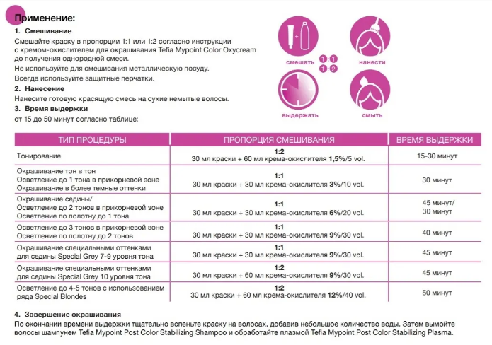 Оттенки 7-9 уровня глубины тона применяются с кремом-окислителем для окрашивания Tefia Mypoint Color Oxycream 6-9 % в пропорции смешивания 1:1; Оттенки 10 уровня c 9 % окислителем в пропорции 1:2. Время выдержки 45 минут!
