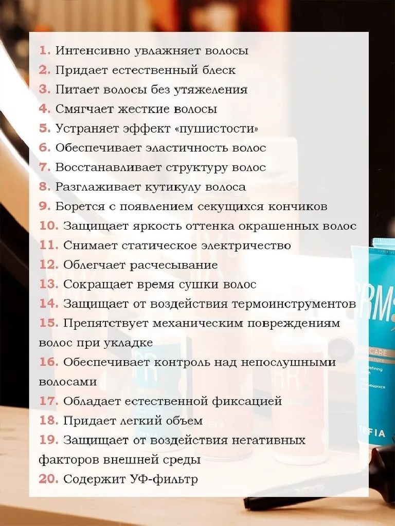 Многофункциональный спрей обладает 20 незаменимыми свойствами для ухода за волосами и стайлинга: Интенсивно увлажняет волосы. Придает естественный блеск. Питает волосы без утяжеления. Смягчает жесткие волосы. Устраняет эффект «пушистости». Обеспечивает эластичность волос. Восстанавливает поврежденную структуру. Разглаживает кутикулу волоса. Борется с появлением секущихся кончиков. Защищает яркость оттенка окрашенных волос. Снимает статическое электричество. Облегчает расчесывание. Сокращает время сушки волос. Защищает от воздействия термоинструментов. Препятствует механическим повреждениям волос при укладке. Обеспечивает контроль над непослушными волосами. Обладает естественной фиксацией. Придает легкий объем. Защищает от воздействия негативных факторов окружающей среды. Содержит УФ-фильтр.