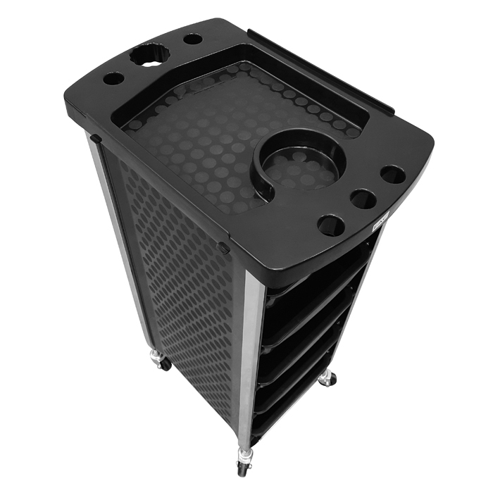 Каркас: хромированныйЯщики: выдвижные, из ударопрочного пластика, 5 штВерхняя секция: из прочного пластика, с углублением и ровной рабочей поверхностью, имеет небольшие отверстия под инструмент, а также возможность размещения лотков с обеих сторон для увеличения рабочей зоныДержатель фена: ✔, в виде небольшого отверстия диаметром 60 ммКолеса: прочная резинаЦвет: черныйПроизводитель: КНРРазмеры (ШхГхВ): 310х475х870 мм В НАЛИЧИИ