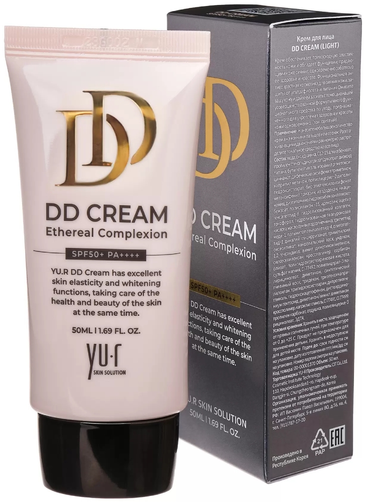 Это универсальное корректирующее средство для лица, имеющее широкий спектр действия. Он работает по принципу Dynamic Do-All: увлажняет, ухаживает, омолаживает и маскирует. Подходит для любого типа кожи. DD-крем YU.R объединил в себе все преимущества предыдущих алфавитных кремов ВВ и СС, и, практически, является мастером визажа. Но ключевой особенностью и задачей DD-крема считается не тонирование или увлажнение, а борьба с первыми признаками старения кожи и защита от ультрафиолетовых лучей.